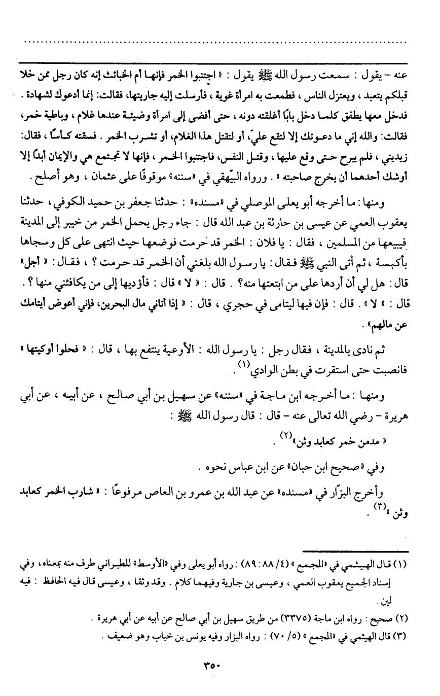 ومنها: ما أخرجه أبو يعلى الموصلي في " مسنده ": حدثنا جعفر بن حميد الكوفي، حدثنا يعقوب العمي عن عيسى بن حارثة بن عبد الله قال: «جاء رجل يحمل الخمر من خيبر إلى المدينة فيبيعها من المسلمين، فقال: يا فلان: الخمر قد حرمت فوضعها حيث انتهى على كل وسجاها بأكبسة، ثم أتى النبي - صَلَّى اللَّهُ عَلَيْهِ وَسَلَّمَ - فقال: يا رسول الله بلغني أن الخمر قد حرمت؟، فقال: " أجل " قال: هل لي أن أردها على من ابتعتها منه؟. قال: " لا " قال: فأؤديها إلى من يكافئني منها؟. قال: " لا ". قال: فإن فيها ليتامى في حجري، قال: " إذا أتاني مال البحرين، فإني أعوض أيتامك عن مالهم ".