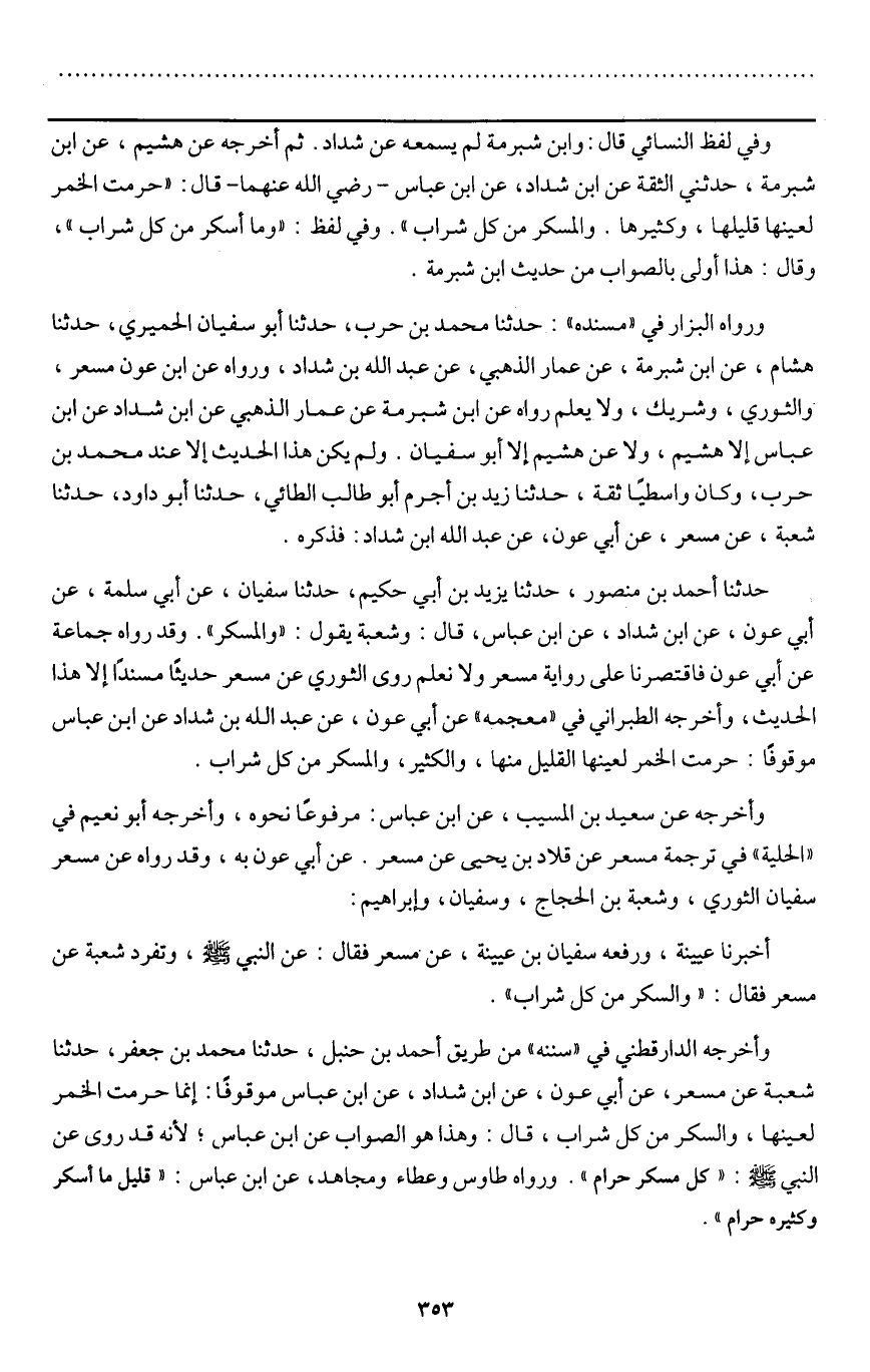 ـــــــــــــــــــــــــــــQوفي لفظ النسائي قال: وابن شبرمة لم يسمعه عن شداد. ثم أخرجه عن هشيم، عن ابن شبرمة، حدثني الثقة عن ابن شداد، عن ابن عباس - رَضِيَ اللَّهُ عَنْهُمَا - قال: «حرمت الخمر لعينها قليلها، وكثيرها. والمسكر من كل شراب» . وفي لفظ: «وما أسكر من كل شراب» ، وقال: هذا أولى بالصواب من حديث ابن شبرمة.
