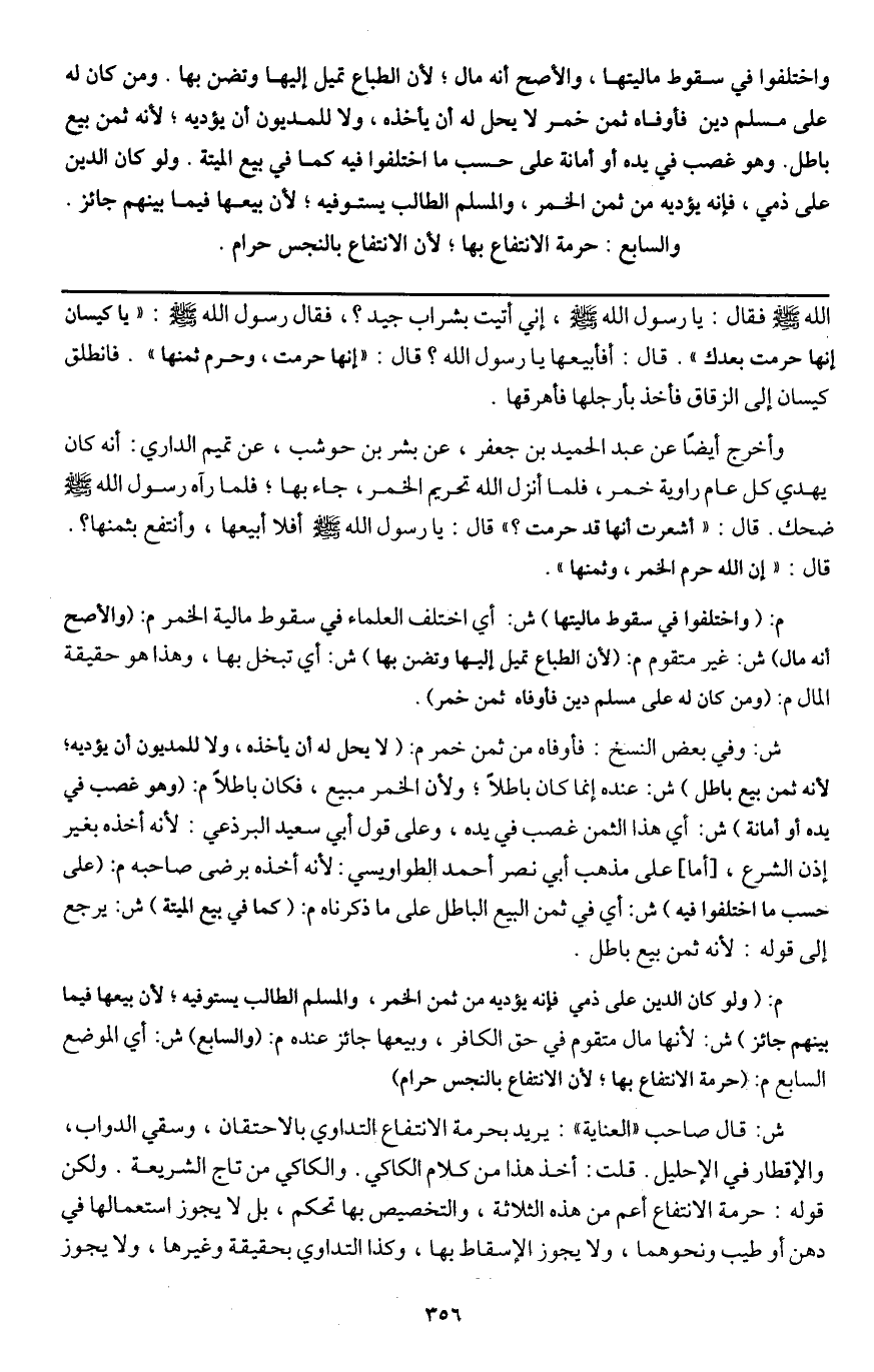 واختلفوا في سقوط ماليتها، والأصح أنه مال؛ لأن الطباع تميل إليها وتضن بها. ومن كان له على مسلم دين فأوفاه ثمن خمر لا يحل له أن يأخذه، ولا للمديون أن يؤديه؛ لأنه ثمن بيع باطل. وهو غصب في يده أو أمانة على حسب ما اختلفوا فيه كما في بيع الميتة. ولو كان الدين على ذمي، فإنه يؤديه من ثمن الخمر، والمسلم الطالب يستوفيه؛ لأن بيعها فيما بينهم جائز. والسابع: حرمة الانتفاع بها؛ لأن الانتفاع بالنجس حرام.