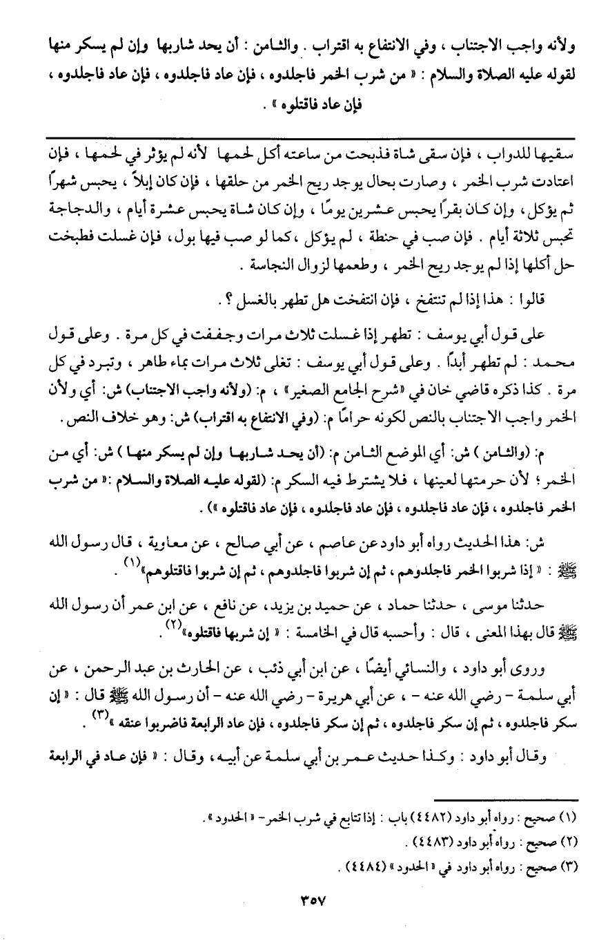 والثامن: أن يحد شاربها وإن لم يسكر منها لقوله - عَلَيْهِ الصَّلَاةُ وَالسَّلَامُ -: «من شرب الخمر فاجلدوه، فإن عاد فاجلدوه، فإن عاد فاجلدوه، فإن عاد فاقتلوه»