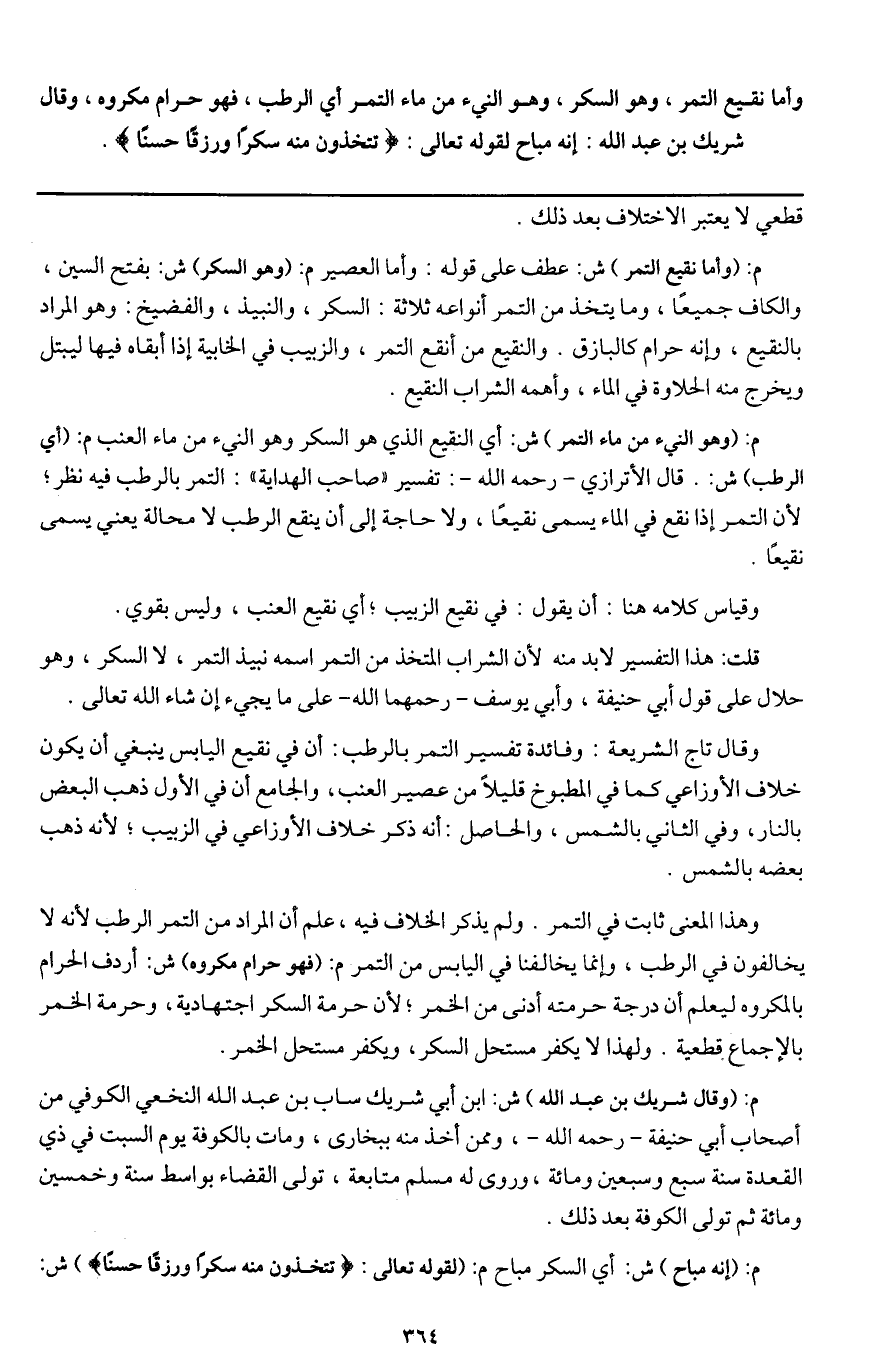 وأما نقيع التمر، وهو السكر، وهو النيء من ماء التمر أي الرطب، فهو حرام مكروه، وقال شريك بن عبد الله: إنه مباح لِقَوْلِهِ تَعَالَى: {تَتَّخِذُونَ مِنْهُ سَكَرًا وَرِزْقًا حَسَنًا} [النحل: 67] .