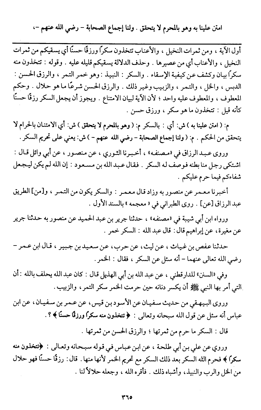 م: (امتن علينا به) ش: أي بالسكر م: (وهو بالمحرم لا يتحقق) ش: أي الامتنان بالحرام لا يتحقق من الحكم. م: (ولنا إجماع الصحابة - رَضِيَ اللَّهُ عَنْهُمْ -) ش: يعني على تحريم السكر.