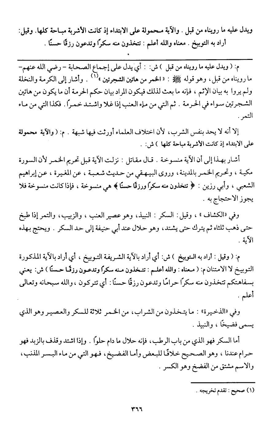 وفي " الكشاف "، وقيل: السكر: النبيذ، وهو عصير العنب، والزبيب، والتمر إذا طبخ حتى ذهب ثلثاه ثم يترك حتى يشتد، وهو حلال عند أبي حنيفة إلى حد السكر. ويحتج بهذه الآية.