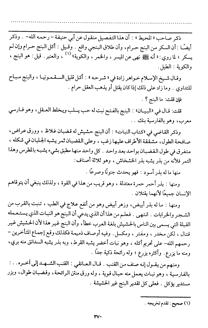 ومنها: ما له بذر أبيض، وزهر أبيض وهو من أنفع علاج في الطب، تنبت بالقرب من الشجر والخرابات. انتهى. فعلم من هذا أن الذي يدعي أن البنج هو النبات الذي يستعمله القبلة التي يسمى بين الناس بالحشيش بلغة العرب خطأ، وأن البنج غير هذا لأن الحشيش غير قتال، لكن مخدر، ومفتر، ومكسل. وفيه أوصاف ذميمة فكذلك وقع إجماع المتأخرين - رَحِمَهُمُ اللَّهُ - على تحريم أكله، وهو نبات أخضر يشبه القرط، وبه بذر يشبه السدانق منه بري، ومنه ما يزرع. وأكثره يزرع؛ وله رائحة ذكية جدا.