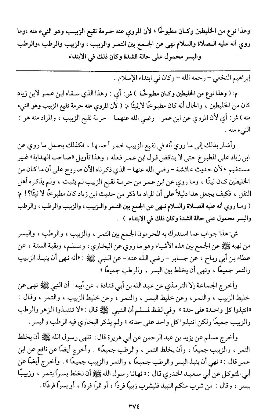 وأخرج مسلم عن يزيد بن عبد الرحمن عن أبي هريرة قال: «نهى رسول الله - صَلَّى اللَّهُ عَلَيْهِ وَسَلَّمَ - أن يخلط التمر، والزبيب جميعا، وأن يخلط التمر، والرطب جميعا» . وأخرج أيضا عن نافع بن عمر قال: «نهي أن ينبذ البسر والرطب جميعا، والتمر والزبيب جميعا» . وأخرج أيضا عن أبي المتوكل عن أبي سعيد الخدري قال: «نهانا رسول الله - صَلَّى اللَّهُ عَلَيْهِ وَسَلَّمَ - أن نخلط بسرا بتمر، وزبيبا ببسر، وقال: من شرب منكم النبيذ فليشرب زبيبا فردا، أو تمرا فردا، أو بسرا فردا» .