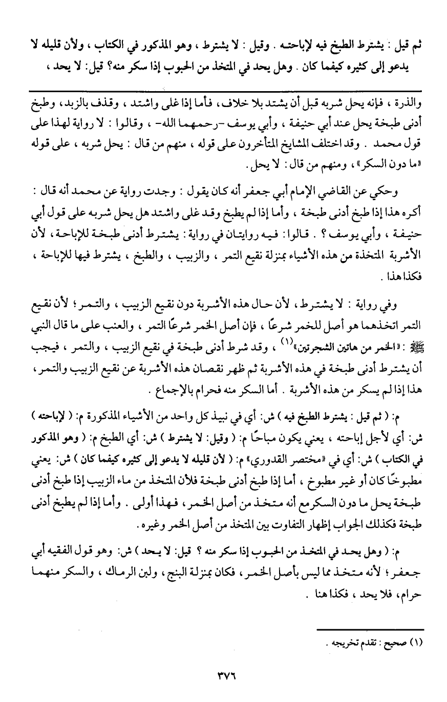 وفي رواية: لا يشترط، لأن حال هذه الأشربة دون نقيع الزبيب، والتمر؛ لأن نقيع التمر اتخذهما هو أصل للخمر شرعا، فإن أصل الخمر شرعا التمر، والعنب على ما قال النبي - صَلَّى اللَّهُ عَلَيْهِ وَسَلَّمَ -: «الخمر من هاتين الشجرتين» ، وقد شرط أدنى طبخة في نقيع الزبيب، والتمر، فيجب أن يشترط أدنى طبخة في هذه الأشربة ثم ظهر نقصان هذه الأشربة عن نقيع الزبيب والتمر، هذا إذا لم يسكر من هذه الأشربة. أما السكر منه فحرام بالإجماع.