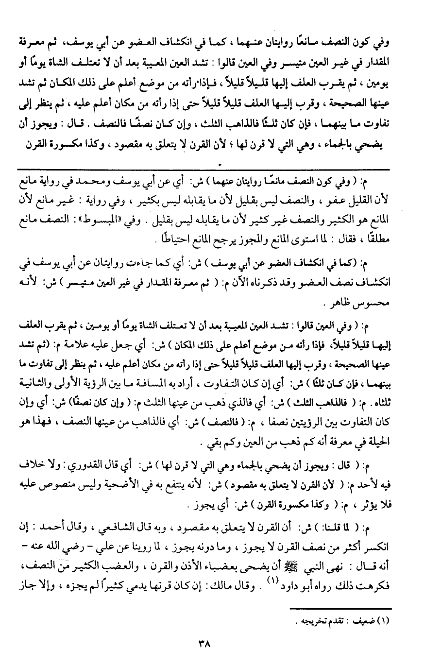 وفي كون النصف مانعا روايتان عنهما، كما في انكشاف العضو عن أبي يوسف، ثم معرفة المقدار في غير المعين متيسر وفي العين قالوا: تشد العين المعيبة بعد أن لا تعتلف الشاة يوما أو يومين، ثم يقرب العلف إليها قليلا قليلا، فإذا رأته من موضع أعلم على ذلك المكان، ثم تشد عينها الصحيحة، وقرب إليها العلف قليلا قليلا حتى إذا رأته من مكان أعلم عليه، ثم ينظر إلى تفاوت ما بينهما، فإن كان ثلثا، فالذاهب الثلث، وإن كان نصفا، فالنص`ف قال: ويجوز أن يضحي بالجماء، وهي التي لا قرن لها؛ لأن القرن لا يتعلق به مقصود، وكذا مكسورة القرن