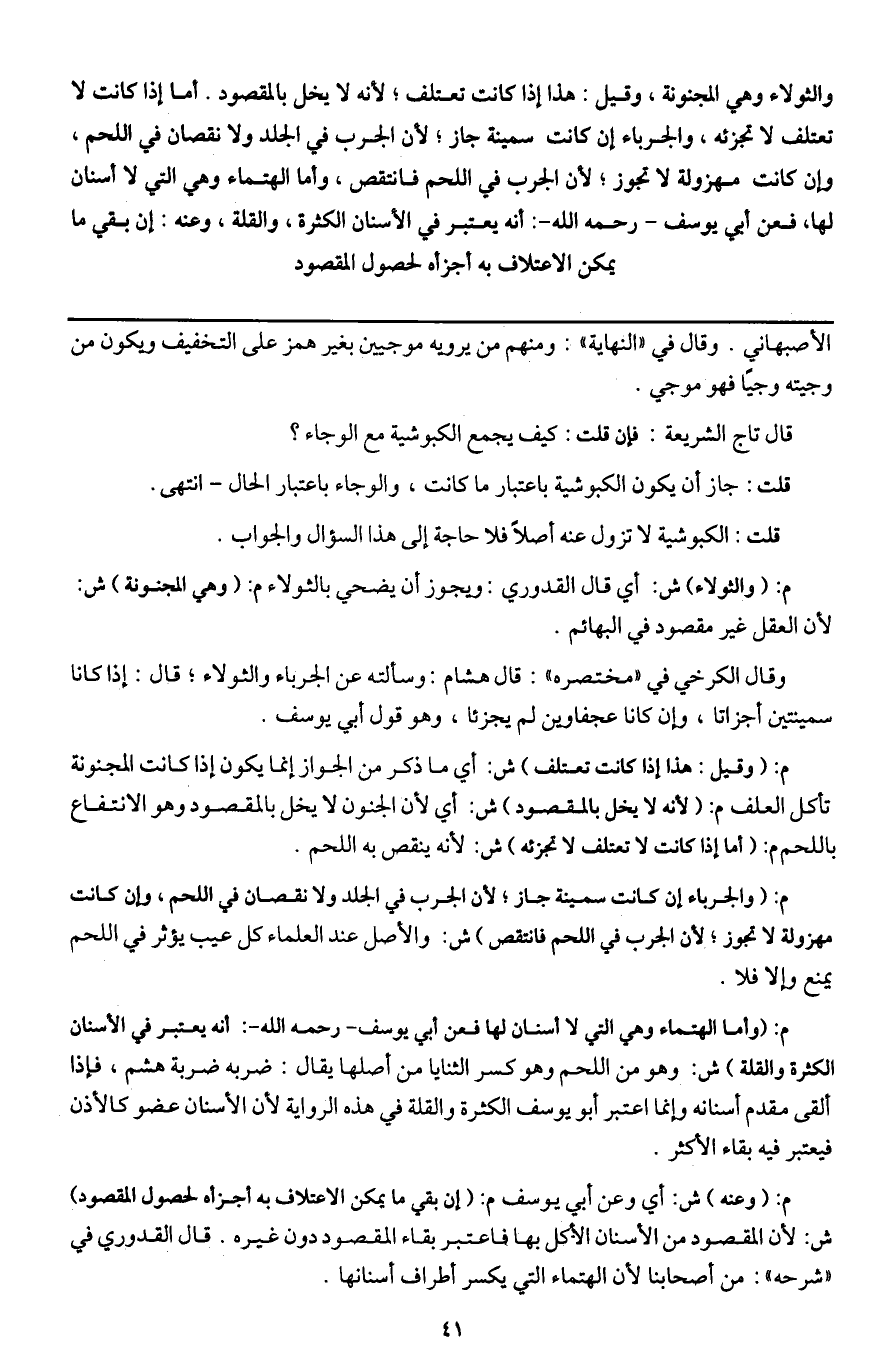 والثولاء وهي المجنونة، وقيل: هذا إذا كانت تعتلف؛ لأنه لا يخل بالمقصود. أما إذا كانت لا تعتلف لا تجزئه، والجرباء إن كانت سمينة جاز؛ لأن الجرب في الجلد ولا نقصان في اللحم، وإن كانت مهزولة لا تجوز؛ لأن الجرب في اللحم فانتقص، وأما الهتماء وهي التي لا أسنان لها، فعن أبي يوسف - رَحِمَهُ اللَّهُ -: أنه يعتبر في الأسنان الكثرة، والقلة، وعنه: إن بقي ما يمكن الاعتلاف به أجزأه لحصول المقصود