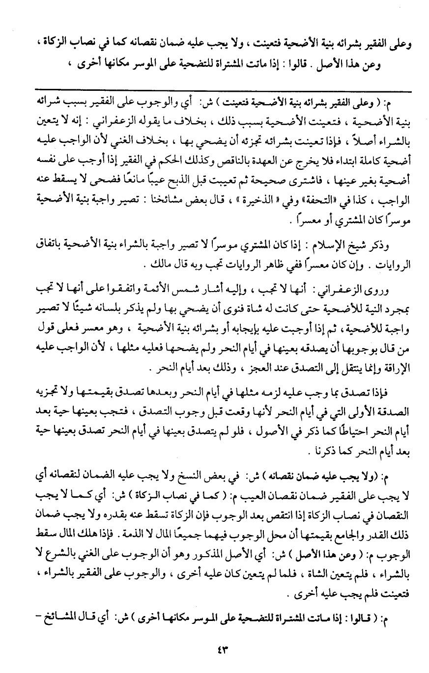 وعلى الفقير بشرائه بنية الأضحية فتعينت، ولا يجب عليه ضمان نقصانه كما في نصاب الزكاة، وعن هذا الأصل. قالوا: إذا ماتت المشتراة للتضحية على الموسر مكانها أخرى.