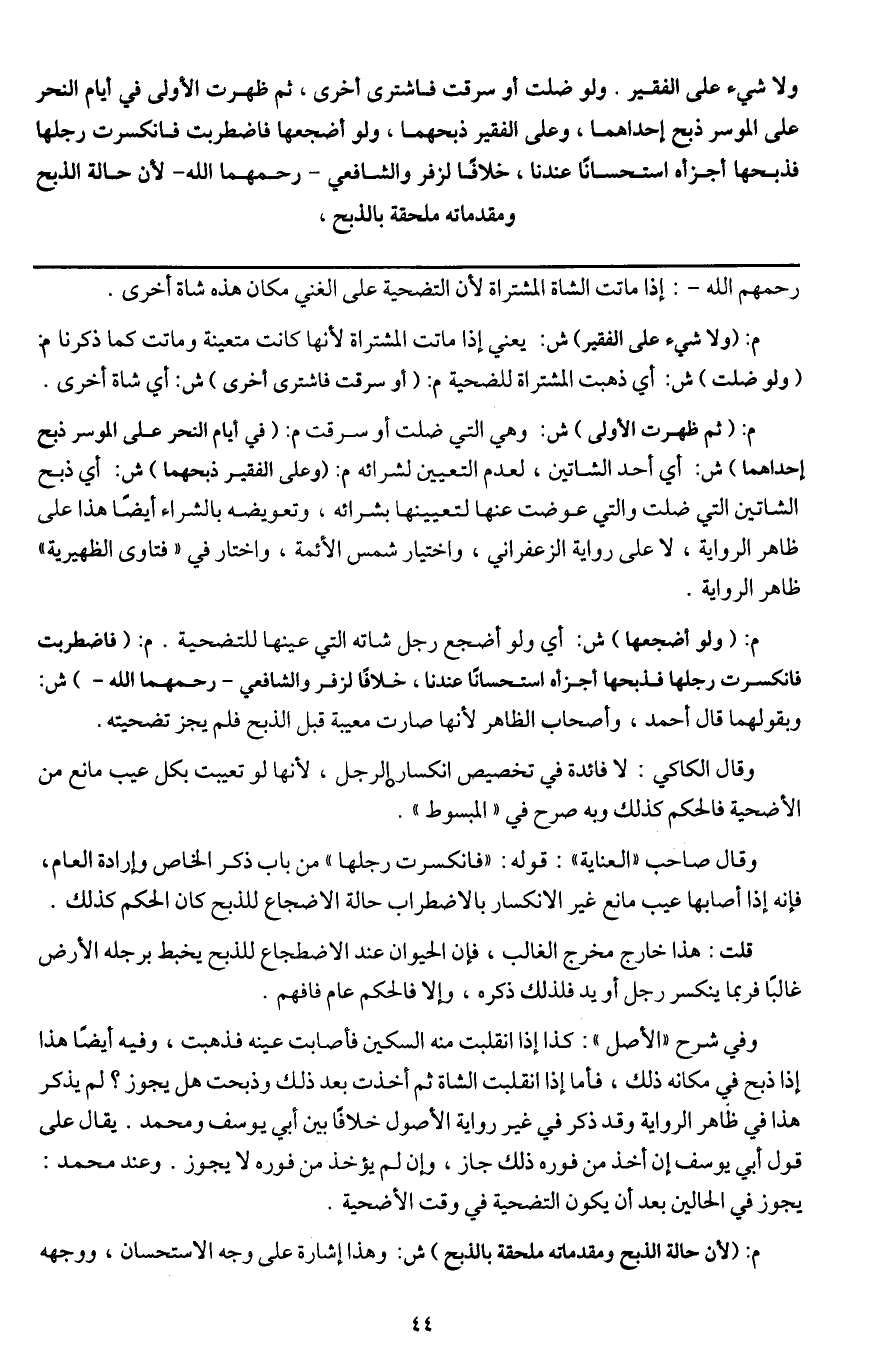 وقال صاحب " العناية ": قوله: " فانكسرت رجلها " من باب ذكر الخاص وإرادة العام، فإنه إذا أصابها عيب مانع غير الانكسار بالاضطراب حالة الإضجاع للذبح كان الحكم كذلك.