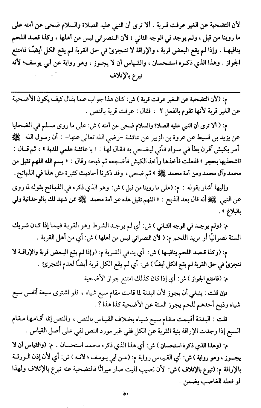لأن التضحية عن الغير عرفت قربة. ألا ترى أن النبي - عَلَيْهِ الصَّلَاةُ وَالسَّلَامُ - ضحى عن أمته على ما روينا من قبل، ولم يوجد في الوجه الثاني؛ لأن النصراني ليس من أهلها، وكذا قصد اللحم ينافيها. وإذا لم يقع البعض قربة، والإراقة لا تتجزأ في حق القربة لم يقع الكل أيضا فامتنع الجواز. وهذا الذي ذكره استحسان، والقياس أن لا يجوز، وهو رواية عن أبي يوسف؛ لأنه تبرع بالإتلاف