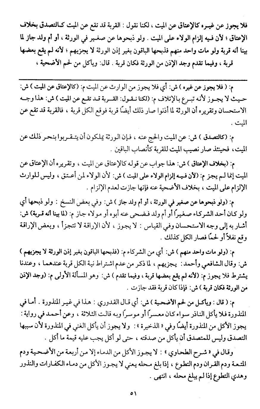 م: (كالتصدق) ش: عن الميت والحج عنه، فإن الورثة يملكون أن يتقربوا بنحو ذلك عن الميت، فحينئذ صار نصيب الميت للقربة كأنصاب الباقين.