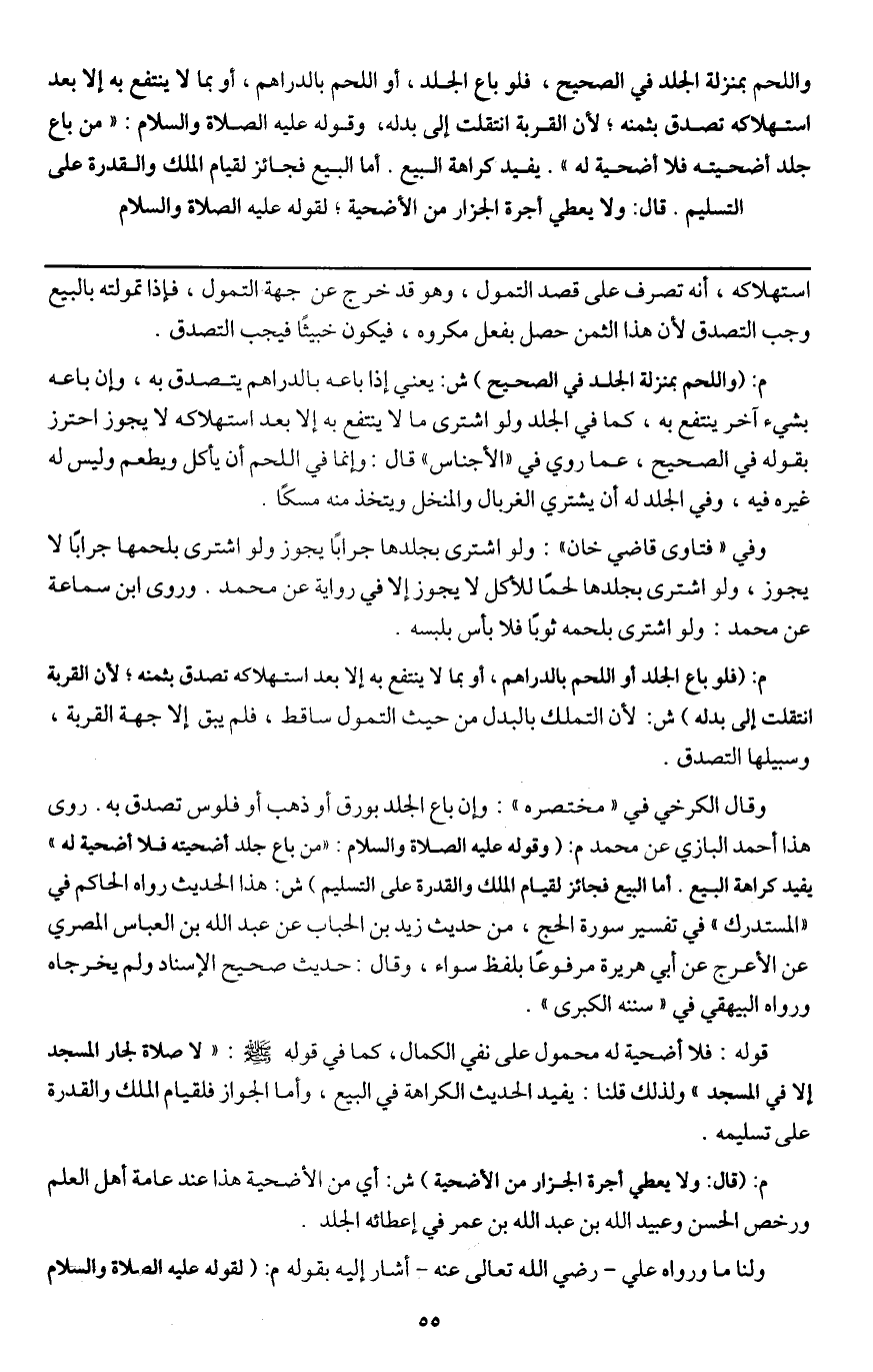 وقال الكرخي في " مختصره ": وإن باع الجلد بورق أو ذهب أو فلوس تصدق به. روى هذا أحمد البازي عن محمد م: (وقوله - عَلَيْهِ الصَّلَاةُ وَالسَّلَامُ -: " من باع جلد أضحيته فلا أضحية له " يفيد كراهة البيع. أما البيع فجائز لقيام الملك والقدرة على التسليم) ش: هذا الحديث رواه الحاكم في " المستدرك " في تفسير سورة الحج، من حديث زيد بن الحباب عن عبد الله بن عباس المصري عن الأعرج عن أبي هريرة مرفوعا بلفظ سواء، وقال: حديث صحيح الإسناد ولم يخرجاه ورواه البيهقي في " سننه الكبرى ".