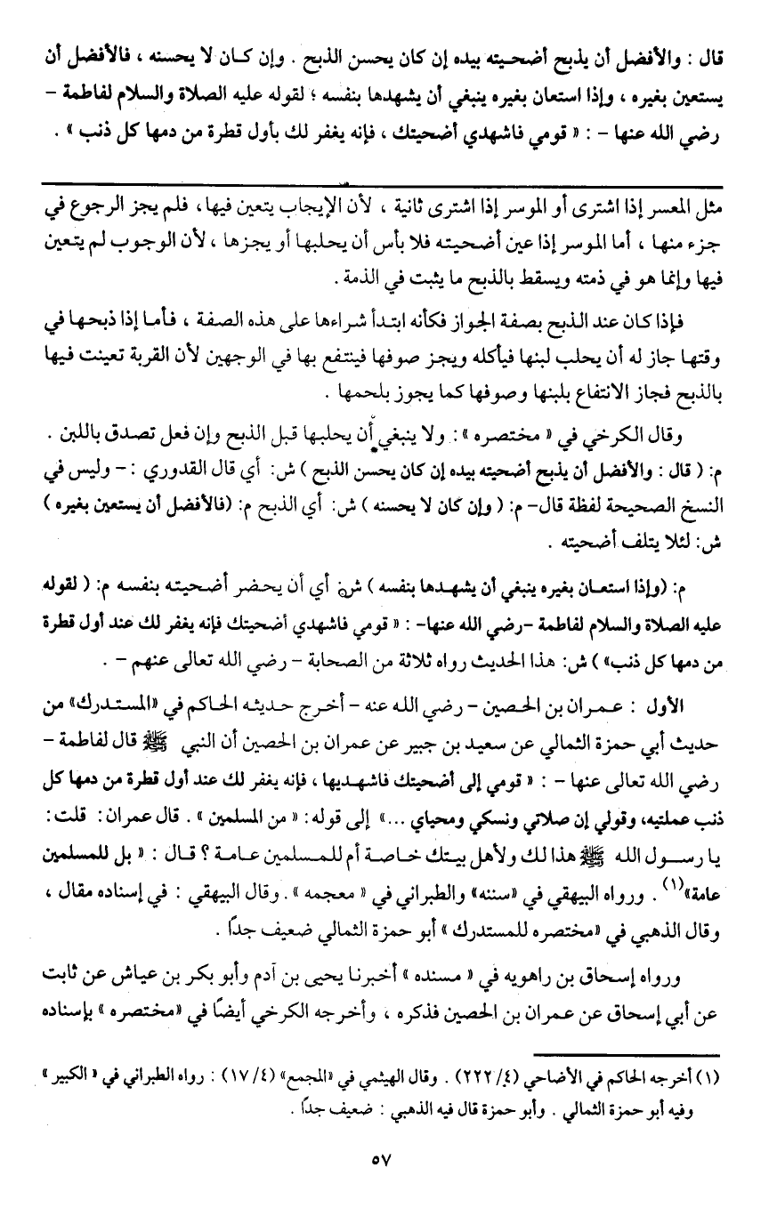 الأول: عمران بن الحصين - رَضِيَ اللَّهُ عَنْهُ - أخرج حديثه الحاكم في " المستدرك " من حديث أبي حمزة الثمالي عن سعيد بن جبير عن عمران بن الحصين أن النبي - صَلَّى اللَّهُ عَلَيْهِ وَسَلَّمَ - قال لفاطمة - رَضِيَ اللَّهُ تَعَالَى عَنْهَا -: «قومي إلى أضحيتك فاشهديها، فإنه يغفر لك عند أول قطرة من دمها كل ذنب عملتيه، وقولي إن صلاتي ونسكي ومحياي ... " إلى قوله: " من المسلمين ". قال عمران: قلت: يا رسول الله - صَلَّى اللَّهُ عَلَيْهِ وَسَلَّمَ - هذا لك ولأهل بيت خاصة أم للمسلمين عامة؟ قال: " بل للمسلمين عامة» . ورواه البيهقي في " سننه " والطبراني في " معجمه ". وقال البيهقي: في إسناده مقال، وقال الذهبي في " مختصره للمستدرك " أبو حمزة الثمالي ضعيف جدا.