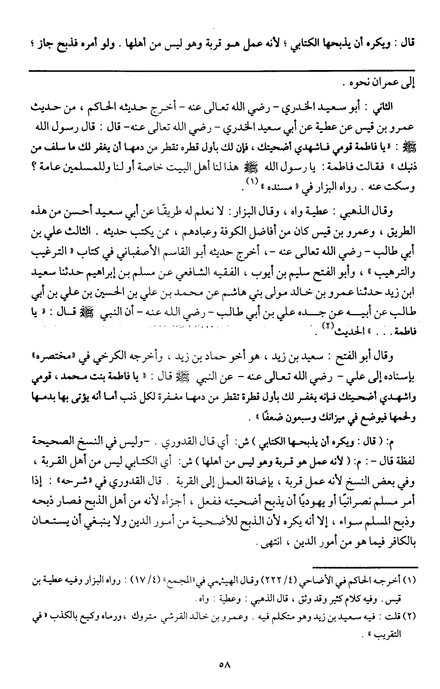 وقال أبو الفتح: سعيد بن زيد، هو أخو حماد بن زيد، وأخرجه الكرخي في " مختصره " بإسناده إلى علي - رَضِيَ اللَّهُ تَعَالَى عَنْهُ - عن النبي - صَلَّى اللَّهُ عَلَيْهِ وَسَلَّمَ - قال: «يا فاطمة بنت محمد، قومي واشهدي أضحيتك فإنه يغفر لك بأول قطرة تقطر من دمها مغفرة لكل ذنب أما أنه يؤتى بها بدمها ولحمها فيوضع في ميزانك وسبعون ضعفا» .