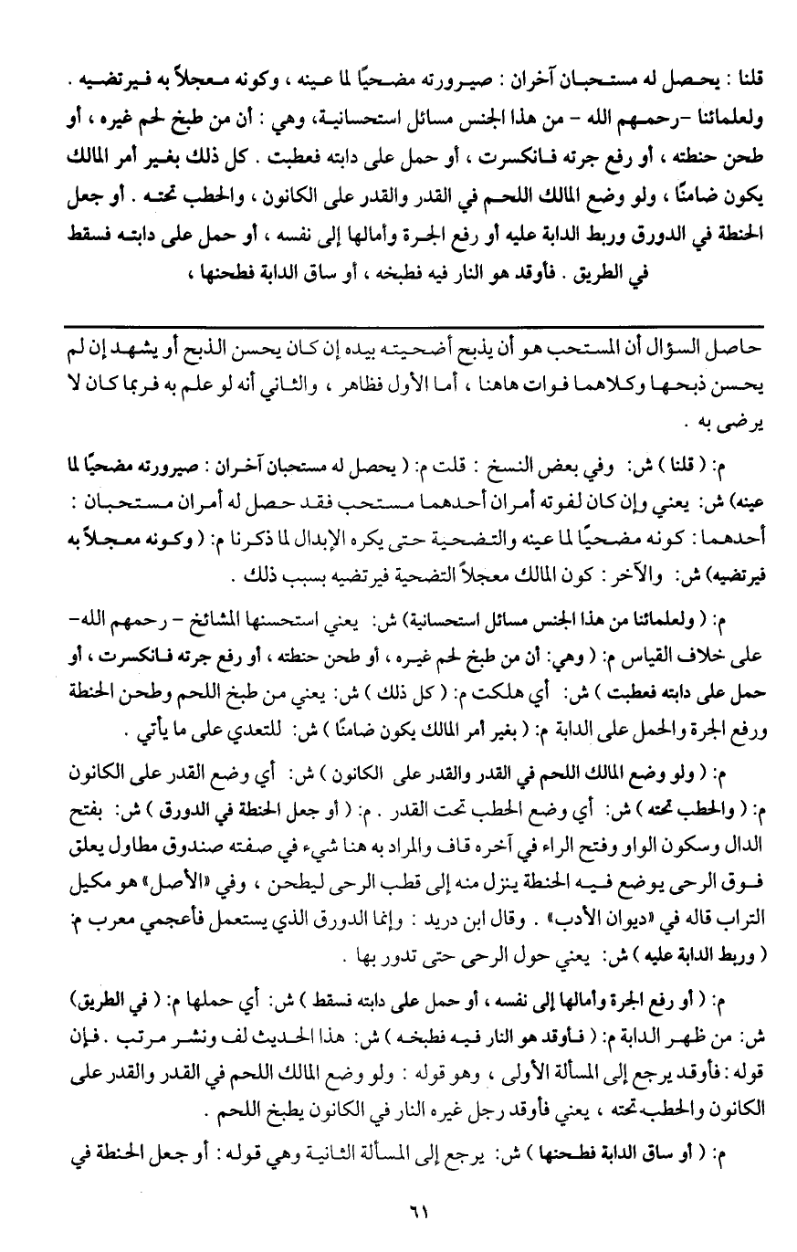 ولعلمائنا - رَحِمَهُمُ اللَّهُ - من هذا الجنس مسائل استحسانية، وهي: أن من طبخ لحم غيره، أو طحن حنطته، أو رفع جرته فانكسرت، أو حمل على دابته فعطبت. كل ذلك بغير أمر المالك يكون ضامنا. ولو وضع المالك اللحم في القدر والقدر على الكانون، والحطب تحته. أو جعل الحنطة في الدورق وربط الدابة عليه أو رفع الجرة وأمالها إلى نفسه، أو حمل على دابته فسقط في الطريق. فأوقد هو النار فيه فطبخه، أو ساق الدابة فطحنها،
