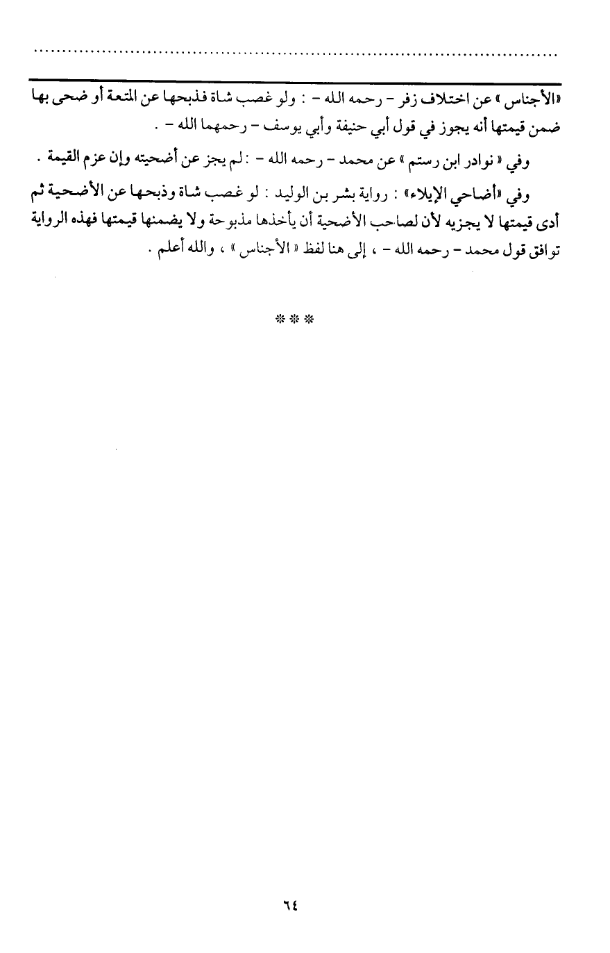 وفي " أضاحي الإيلاء ": رواية بشر بن الوليد: لو غصب شاة وذبحها عن الأضحية ثم أدى قيمتها لا يجزيه؛ لأن لصاحب الأضحية أن يأخذها مذبوحة ولا يضمنها قيمتها فهذه الرواية توافق قول محمد - رَحِمَهُ اللَّهُ -، إلى هنا لفظ " الأجناس "، والله أعلم.