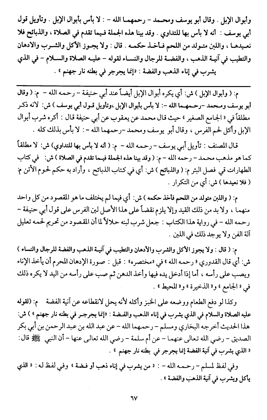 م: (قال: ولا يجوز الأكل والشرب والادهان والتطيب في آنية الذهب والفضة للرجال والنساء) ش: أي قال القدوري " - رَحِمَهُ اللَّهُ - " في " مختصره ": قبل: صورة الادهان المحرم أن يأخذ الإناء ويصب على رأسه، أما إذا أدخل يده فيها وأخذ الدهن ثم صب على رأسه من اليد لا يكره ذلك في " الجامع " و " الذخيرة " و " المحيط ".