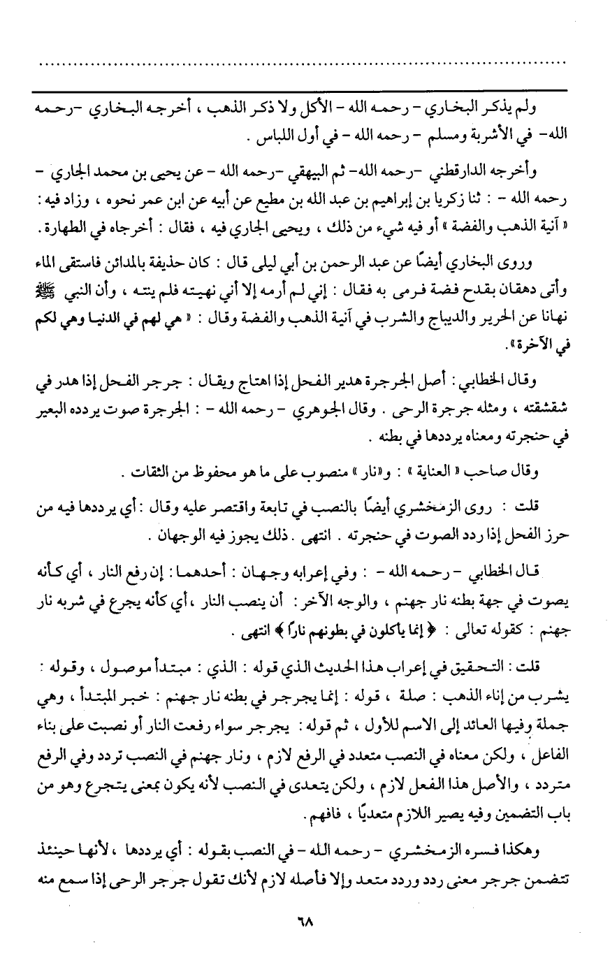 قلت: التحقيق في إعراب هذا الحديث الذي قوله: الذي: مبتدأ موصول، وقوله: يشرب من إناء الذهب: صلة، قوله: إنما يجرجر في بطنه نار جهنم: خبر المبتدأ، وهي جملة وفيها العائد إلى الاسم للأول، ثم قوله: يجرجر سواء رفعت النار أو نصبت على بناء الفاعل، ولكن معناه في النصب متعدد في الرفع لازم، ونار جهنم في النصب تردد وفي الرفع متردد، والأصل هذا الفعل لازم، ولكن يتعدى في النصب؛ لأنه يكون معنى يتجرع وهو من باب التضمين وفيه يصير اللازم متعديا، فافهم.