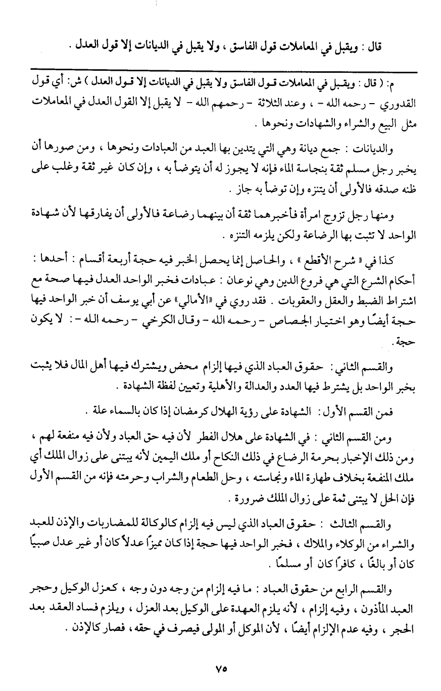 ـــــــــــــــــــــــــــــQم: (قال: ويقبل في المعاملات قول الفاسق ولا يقبل في الديانات إلا قول العدل) ش: أي قول القدوري - رَحِمَهُ اللَّهُ -، وعند الثلاثة - رَحِمَهُمُ اللَّهُ - لا يقبل إلا القول العدل في المعاملات مثل البيع والشراء والشهادات ونحوها.