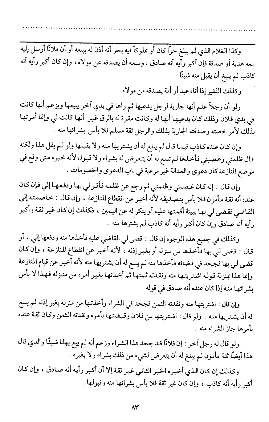 ـــــــــــــــــــــــــــــQوكذا الغلام الذي لم يبلغ حرا كان أو مملوكا فيه بحر أنه أذن له ببيعه أو أن فلانا أرسل إليه معه هدية أو صدقة فإن أكبر رأيه أنه صادق، وسعه أن يصدقه عن مولاه، وإن كان أكبر رأيه أنه كاذب لم ينبغ أن يقبل منه شيئا.