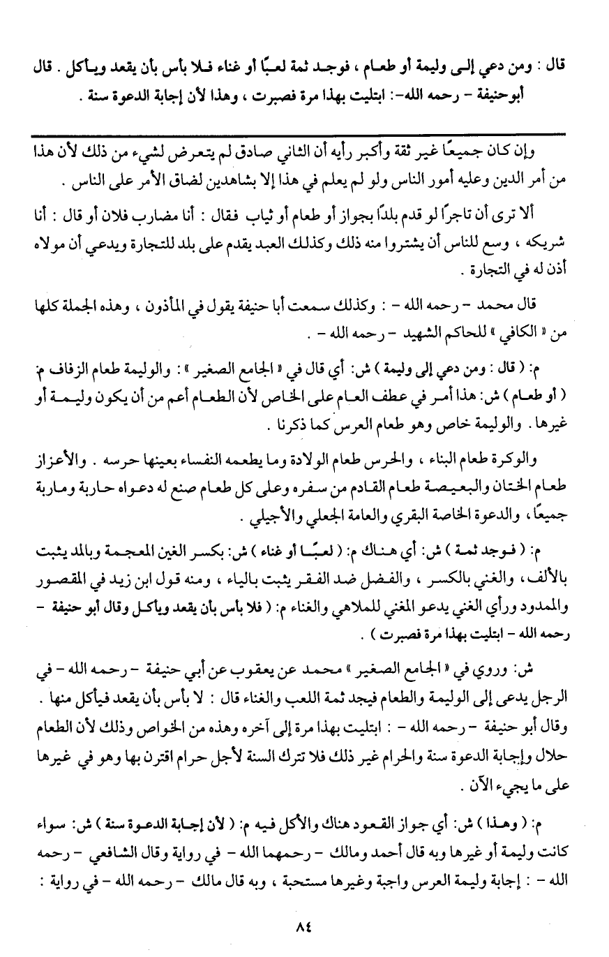 قال: ومن دعي إلى وليمة أو طعام، فوجد ثمة لعبا أو غناء فلا بأس بأن يقعد ويأكل قال أبو حنيفة - رَحِمَهُ اللَّهُ -: ابتليت بهذا مرة فصبرت، وهذا لأن إجابة الدعوة سنة.