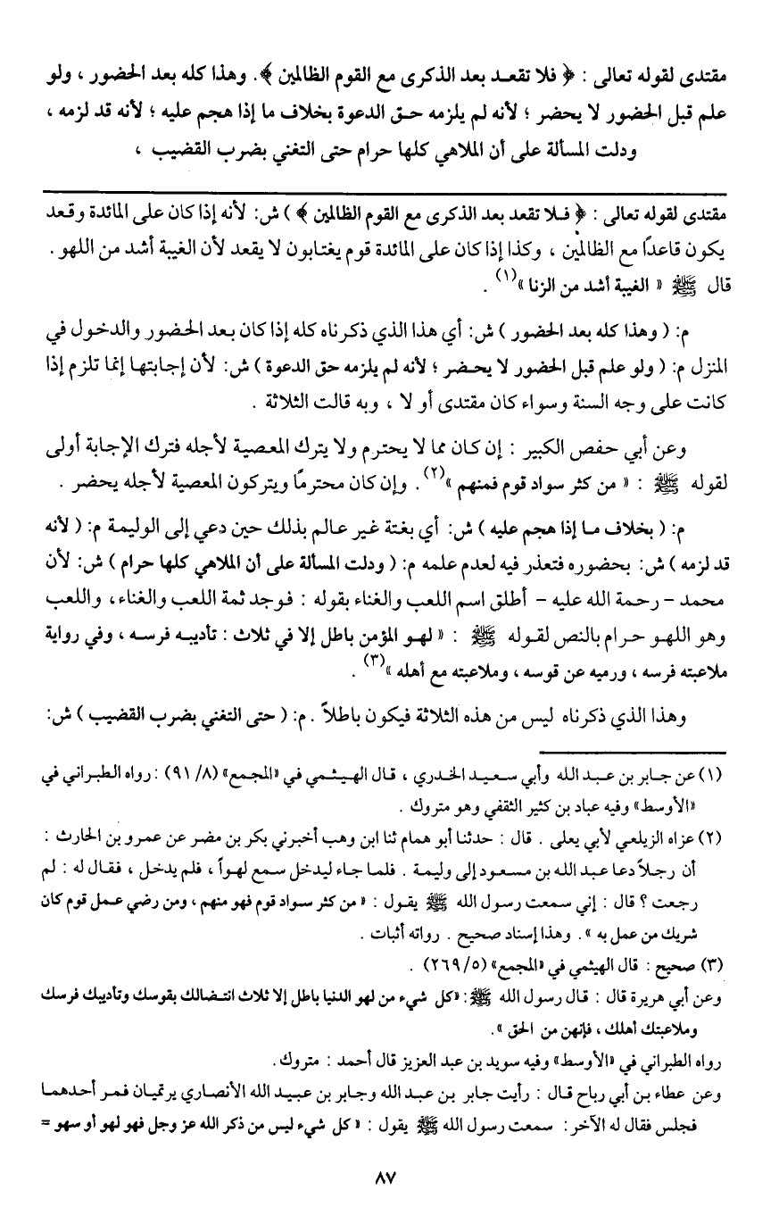مقتدى لِقَوْلِهِ تَعَالَى: {فَلَا تَقْعُدْ بَعْدَ الذِّكْرَى مَعَ الْقَوْمِ الظَّالِمِينَ} [الأنعام: 68] . وهذا كله بعد الحضور، ولو علم قبل الحضور لا يحضر؛ لأنه لم يلزمه حق الدعوة بخلاف ما إذا هجم عليه؛ لأنه قد لزمه ودلت المسألة على أن الملاهي كلها حرام حتى التغني بضرب القضيب,