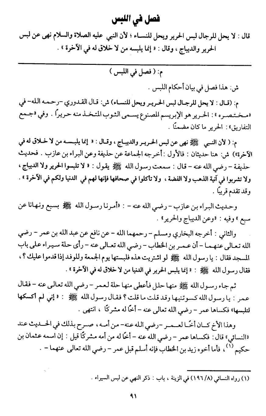 فصل في اللبس قال: لا يحل للرجال لبس الحرير ويحل للنساء؛ لأن النبي - عَلَيْهِ الصَّلَاةُ وَالسَّلَامُ - نهى عن لبس الحرير والديباج، وقال: «إنما يلبسه من لا خلاق له في الآخرة» .