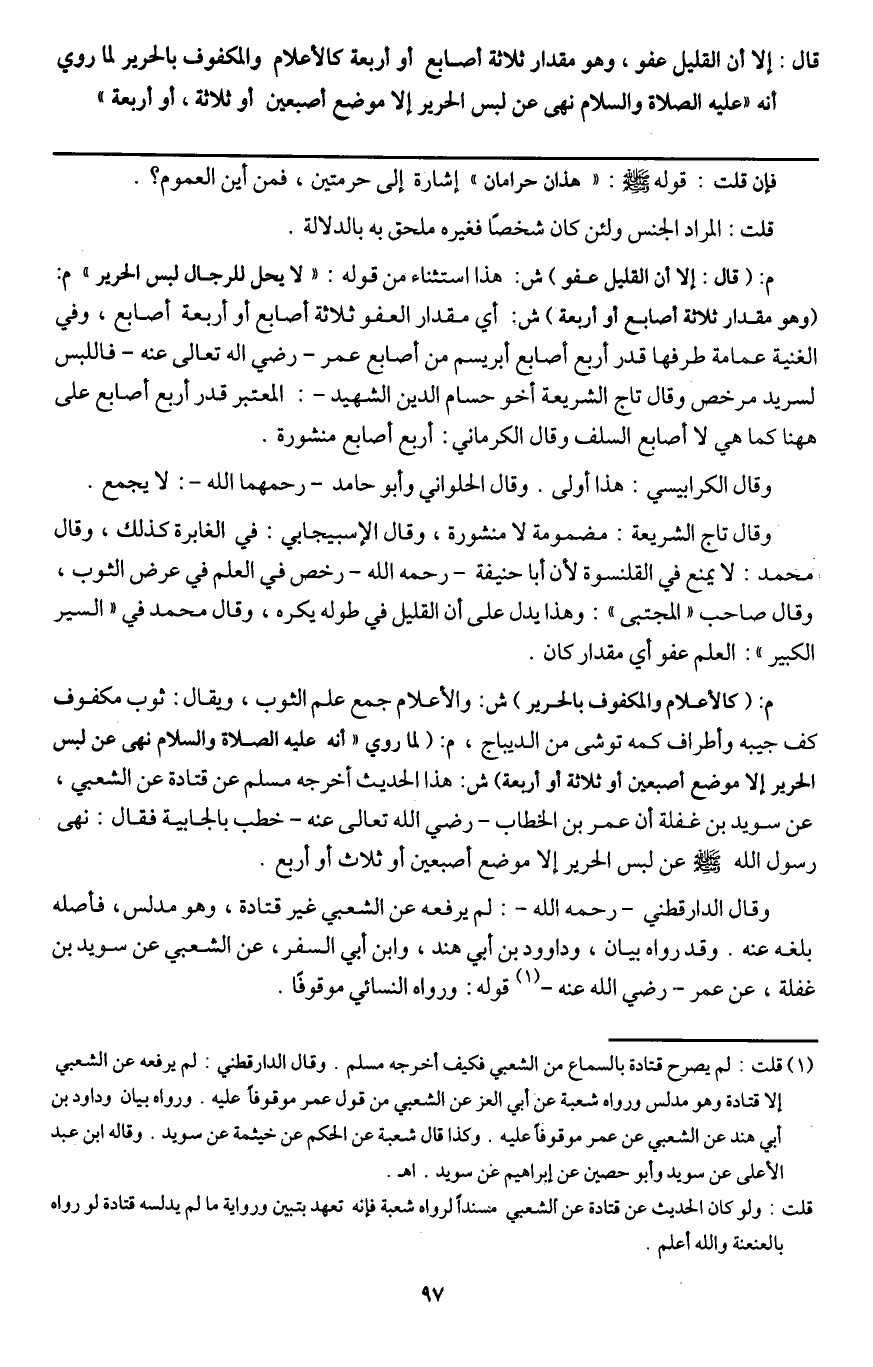 قال: إلا أن القليل عفو، وهو مقدار ثلاثة أصابع أو أربعة كالأعلام والمكفوف بالحرير لما روي أنه " - عَلَيْهِ الصَّلَاةُ وَالسَّلَامُ - «نهى عن لبس الحرير إلا موضع أصبعين أو ثلاثة، أو أربعة» .