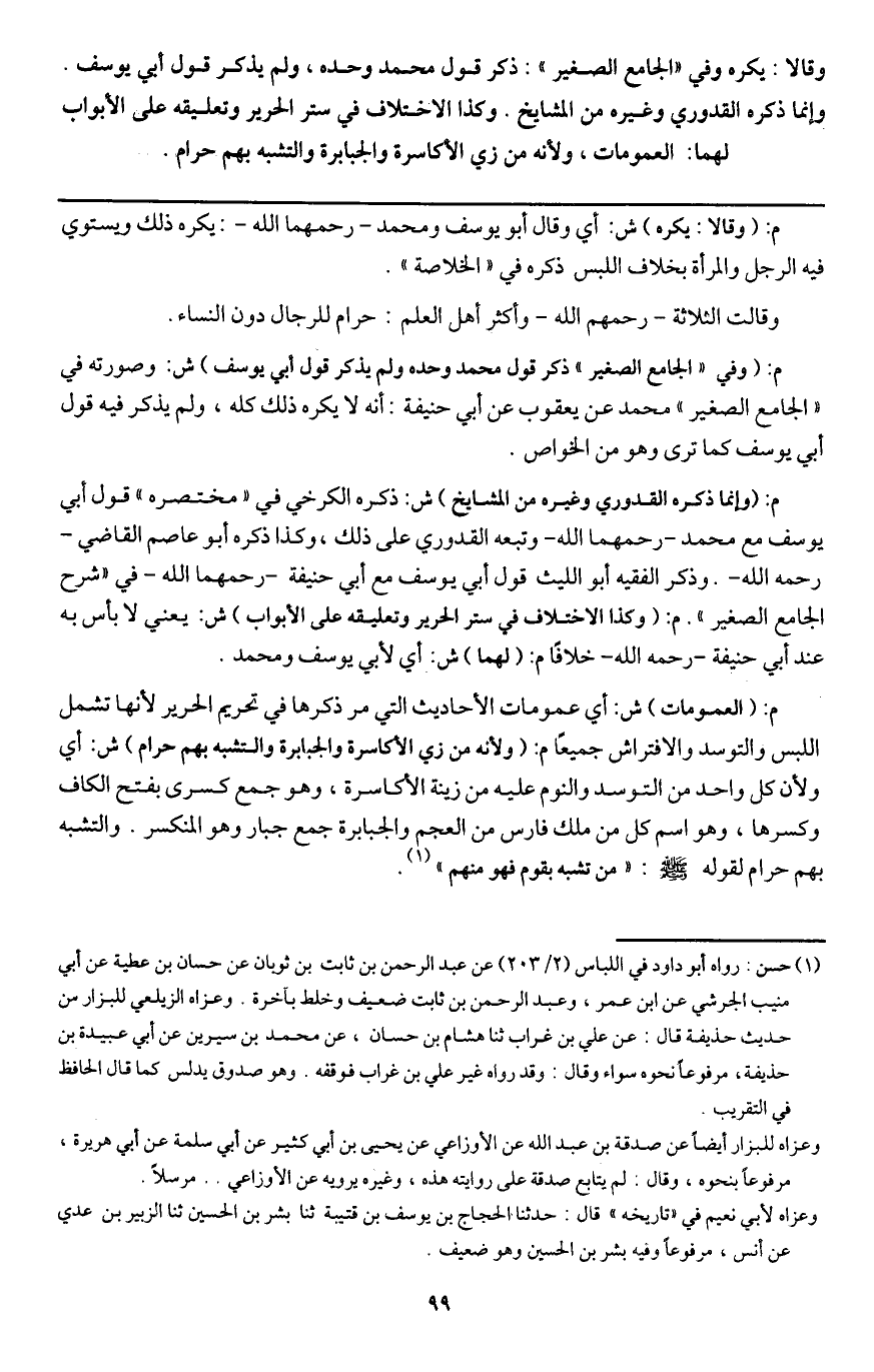 وقالا: يكره وفي " الجامع الصغير ": ذكر قول محمد وحده، ولم يذكر قول أبي يوسف، وإنما ذكره القدوري وغيره من المشايخ. وكذا الاختلاف في ستر الحرير وتعليقه على الأبواب لهما: العمومات، ولأنه من زي الأكاسرة والجبابرة والتشبه بهم حرام.