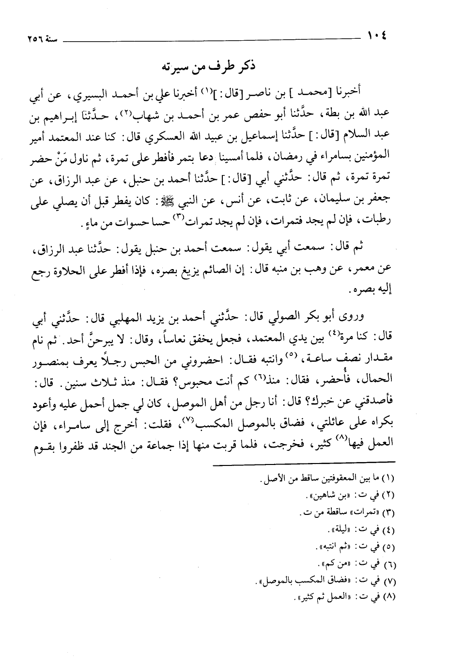 أَخْبَرَنَا [مُحَمَّدُ] بْنُ نَاصِرٍ [قَالَ:] [1] أَخْبَرَنَا عَلِيُّ بْنُ أَحْمَدَ الْبُسَيْرِيُّ، عَنْ أَبِي عَبْدِ اللَّهِ بْنِ بَطَّةَ، حَدَّثَنَا أَبُو حَفْصٍ عُمَرُ بْنُ أَحْمَدَ بْنِ شِهَابٍ [2] ، حَدَّثَنَا إِبْرَاهِيمُ بْنُ عَبْدِ السَّلامِ [قَالَ:] حَدَّثَنَا إِسْمَاعِيلُ بْنُ عُبَيْدِ اللَّهِ الْعَسْكَرِيُّ قَالَ: كُنَّا عِنْدَ الْمُعْتَمِدِ أَمِيرِ الْمُؤْمِنِينَ بِسَامَرَّاءَ فِي رَمَضَانَ، فلما أمسينا دَعَا بِتَمْرٍ فَأَفْطَرَ عَلَى تَمْرَةٍ، ثُمَّ نَاوَلَ مَنْ حَضَرَ تَمْرَةً تَمْرَةً، ثُمَّ قَالَ: حَدَّثَني أَبِي [قَالَ:] حَدَّثَنَا أَحْمَدُ بْنُ حَنْبَلٍ، عَنْ عَبْدِ الرَّزَّاقِ، عَنْ جَعْفَرُ بْنُ سُلَيْمَانَ، عَنْ ثَابِتٍ، عَنْ أَنَسٍ، عَنِ النَّبِيِّ صَلَّى اللَّهُ عَلَيْهِ وَسَلَّمَ: كَانَ يُفْطِرُ قَبْلَ أَنْ يُصَلِّيَ عَلَى رُطَبَاتٍ، فَإِنْ لَمْ يَجِدْ فَتَمَرَاتٌ، فَإِنْ لَمْ يَجِدْ تَمَرَاتٍ [3] حَسَا حَسَوَاتٍ مِنْ مَاءٍ. ثم قَالَ: سمعت أبي يقول: سمعت أَحْمَد بن حنبل يقول: حَدَّثَنَا عبد الرزاق، عن معمر، عن وهب بن منبه قَالَ: إن الصائم يزيغ بصره، فإذا أفطر على الحلاوة رجع إليه بصره.
