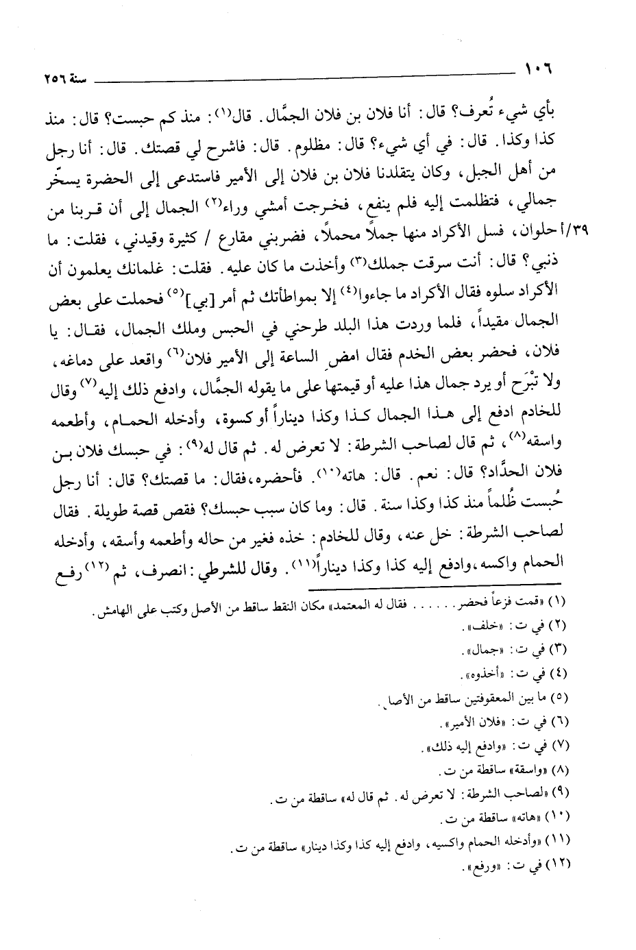 بأي شيء تعرف؟ قَالَ: أنا فلان بن فلان الجمال. قَالَ [1] : منذ كم حبست؟ قَالَ: منذ كذا وكذا. قَالَ: فِي أي شيء؟ قَالَ: مظلوم. قَالَ: فاشرح لي قصتك. قَالَ: أنا رجل من أهل الجبل، وكان يتقلدنا فلان بن فلان إلى الأمير فاستدعى إلى الحضرة يسخر جمالي، فتظلمت إليه فلم ينفع، فخرجت أمشي وراء [2] الجمال إلى أن قربنا من حلوان، فسل الأكراد منها جملا محملا، فضربني مقارع كثيرة وقيدني، فقلت: ما ذنبي؟ قَالَ: أنت سرقت جملك [3] وأخذت ما كان عليه. فقلت: غلمانك يعلمون أن الأكراد سلوه فقال الأكراد ما جاءوا [4] إلا بمواطأتك ثم أمر [بي] [5] فحملت على بَعْض الجمال مقيدا، فلما وردت هذا البلد طرحني في الحبس وملك الجمال، فقال: يا فلان، فحضر بعض الخدم فقال امض الساعة إلى الأمير فلان [6] واقعد على دماغه، ولا تبرح أو يرد جمال هذا عليه أو قيمتها على ما يقوله الجمال، وادفع ذلك إليه [7] وَقَالَ للخادم ادفع إلى هذا الجمال كذا وكذا دينار أو كسوة، وأدخله الحمام، وأطعمه واسقه [8] ، ثم قَالَ لصاحب الشرطة: لا تعرض له. ثم قَالَ له [9] : في حبسك فلان بن فلان الحداد؟ قَالَ: نعم. قَالَ: هاته [10] . فأحضره، فقال: ما قصتك؟ قَالَ: أنا رجل حبست ظلما منذ كذا وكذا سنة. قَالَ: وما كان سبب حبسك؟ فقص قصة طويلة. فقال لصاحب الشرطة: خل عنه، وَقَالَ للخادم: خذه فغير من حاله وأطعمه وأسقه، وأدخله الحمام واكسه، وادفع إليه كذا وكذا دينارا [11] . وَقَالَ للشرطي: انصرف، ثم [12] رفع