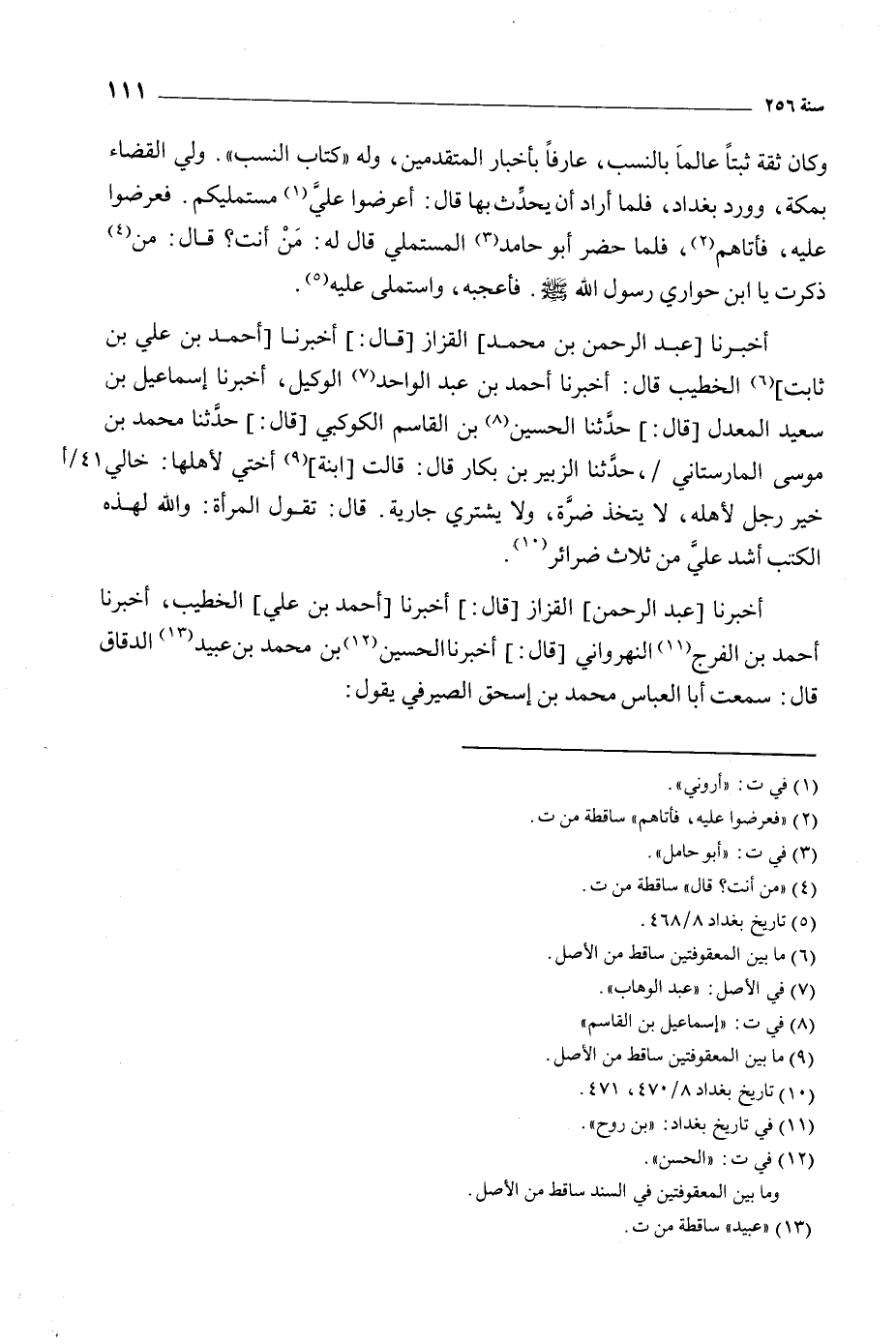 أَخْبَرَنَا [عَبْد الرَّحْمَنِ] القزاز [قَالَ:] أَخْبَرَنَا [أحمد بن علي] الخطيب، أخبرنا أحمد بن الفرج [11] النهرواني [قَالَ:] أَخْبَرَنَا الحسين [12] بْن مُحَمَّد بْن عبيد [13] الدقاق قَالَ: سمعت أبا العباس محمد بن إسحاق الصيرفي يقول: