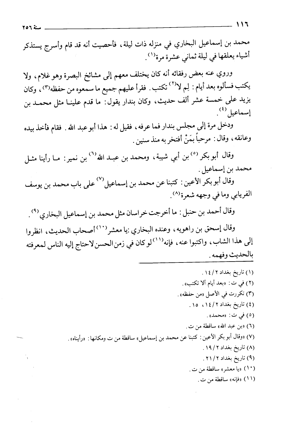 مُحَمَّد بن إسماعيل البخاري في منزله ذات ليلة، فأحصيت أنه قد قام وأسرج يستذكر أشياء يعلقها في ليلة ثماني عشرة مرة [1] .