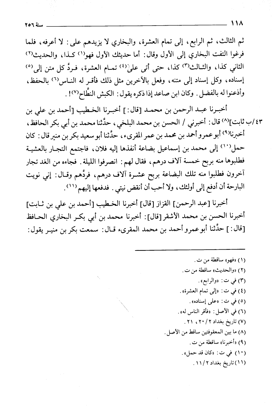 أخبرنا عبد الرحمن بن محمد [قال:] أخبرنا الخطيب [أَحْمَدَ بْنِ عَلِيِّ بْنِ ثَابِتٍ] [8] قَالَ: أَخْبَرَنِي الحَسَن بن مُحَمَّد البلخي، حَدَّثَنَا مُحَمَّد بن أبي بكر الْحَافِظ، أَخْبَرَنَا [9] أبو عمرو أحمد بن محمد بن عمر المقرئ، حَدَّثَنَا أبو سعيد بكر بن منير قَالَ: كان حمل [10] إلى مُحَمَّد بن إسماعيل بضاعة أنفذها إليه فلان، فاجتمع التجار بالعشية فطلبوها منه بربح خمسة آلاف درهم، فقال لهم: انصرفوا الليلة. فجاءه من الغد تجار آخرون فطلبوا منه تلك البضاعة بربح عشرة آلاف درهم، فردهم وَقَالَ: إني نويت البارحة أن أدفع إلى أولئك، ولا أحب أن أنقض نيتي. فدفعها إليهم [11] .