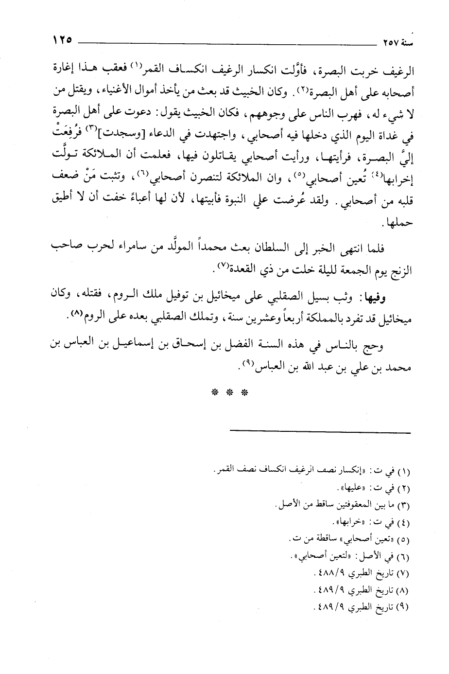 الرغيف خربت البصرة، فأولت انكسار الرغيف انكساف القمر [1] فعقب هذا إغارة أصحابه على أهَلِ البصرة [2] . وكان الخبيث قد بعث من يأخذ أموال الأغنياء، ويقتل من لا شيء له، فهرب النَّاس على وجوههم، فكان الخبيث يقول: دعوت على أهل البصرة في غداة اليوم الذي دخلها فِيهِ أصحابي، واجتهدت في الدعاء [وسجدت] [3] فرفعت إلي البصرة، فرأيتها، ورأيت أصحابي يقاتلون فيها، فعلمت أن الملائكة تولت إخرابها [4] تعين أصحابي [5] ، وأن الملائكة لتنصرن أصحابي [6] ، وتثبت من ضعف قلبه من أصحابي. ولقد عرضت علي النبوة فأبيتها، لأن لها أعباء خفت أن لا أطيق حملها.