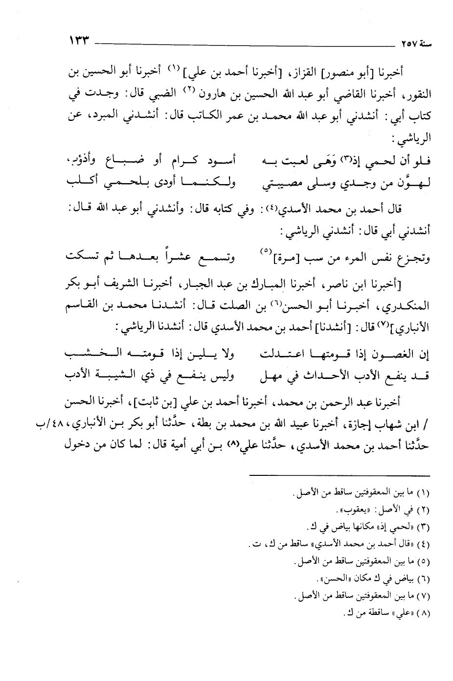 [أَخْبَرَنَا ابْنُ نَاصِرٍ، أَخْبَرَنَا الْمُبَارَكُ بْنُ عَبْدِ الجبار، أَخْبَرَنَا الشريف أبو بكر المكندري، أَخْبَرَنَا أبو الْحَسَن [6] بن الصلت قَالَ: أنشدنا مُحَمَّد بن القاسم الأنباري] [7] قَالَ: [أنشدنا] أَحْمَد بن مُحَمَّد الأسدي قَالَ: أنشدنا الرياشي: