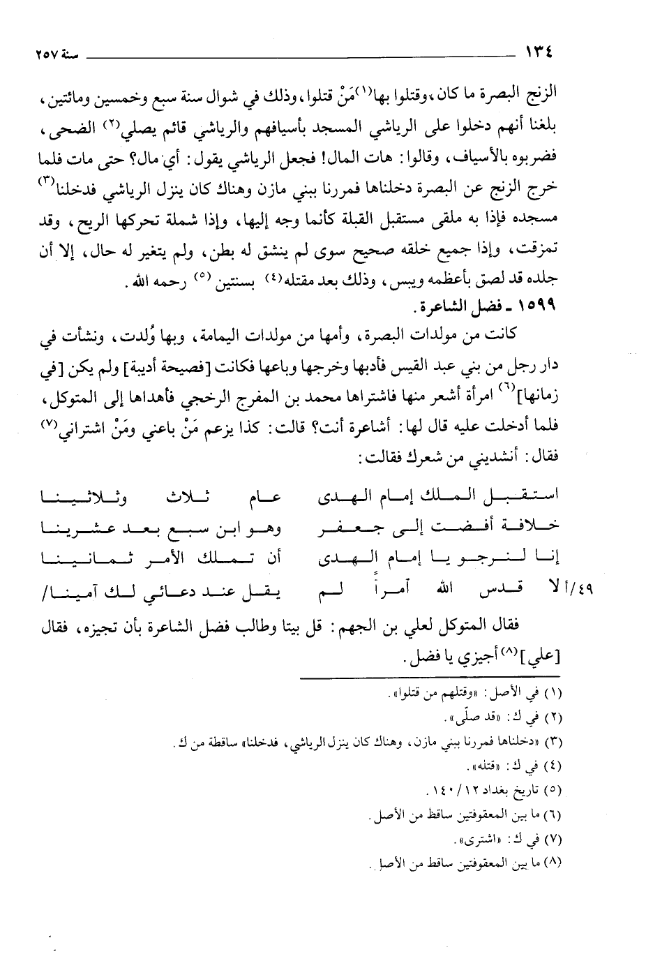 الزنج البصرة ما كان، وقتلوا بها [1] من قتلوا، وذلك في شوال سنة سبع وخمسين ومائتين، بلغنا أنهم دخلوا على الرياشي المسجد بأسيافهم والرياشي قائم يصلى [2] الضحى، فضربوه بالأسياف، وقالوا: هات المال! فجعل الرياشي يقول: أي مال؟ حتى مات فلما خرج الزنج عن البصرة دخلناها فمررنا ببني مازن وهناك كَانَ ينزل الرياشي فدخلنا [3] مسجده فإذا به ملقى مستقبل القبلة كأنما وجه إليها، واذا شملة تحركها الريح، وقد تمزقت، واذا جميع خلقه صحيح سوى لم ينشق له بطن، ولم يتغير له حال، إلا أن جلده قد لصق بأعظمه ويبس، وذلك بعد مقتله [4] بسنتين [5] رحمه الله.