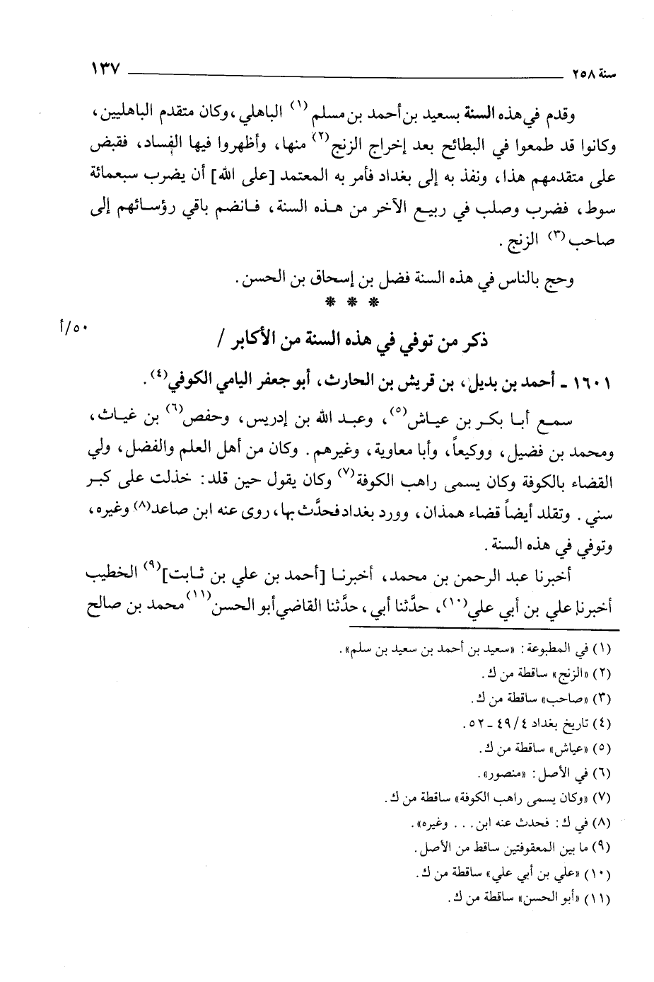 وقدم في هذه السنة بسعيد بن أَحْمَد بن مسلم [1] الباهلي، وكان متقدم الباهليين، وكانوا قد طمعوا في البطائح بعد إخراج الزنج [2] منها، وأظهروا فيها الفساد، فقبض على متقدمهم هذا، ونفذ به إلى بغداد فأمر به المعتمد [على الله] أن يضرب سبعمائة سوط، فضرب وصلب في ربيع الآخر من هذه السنة، فانضم باقي رؤسائهم إلى صاحب [3] الزنج.