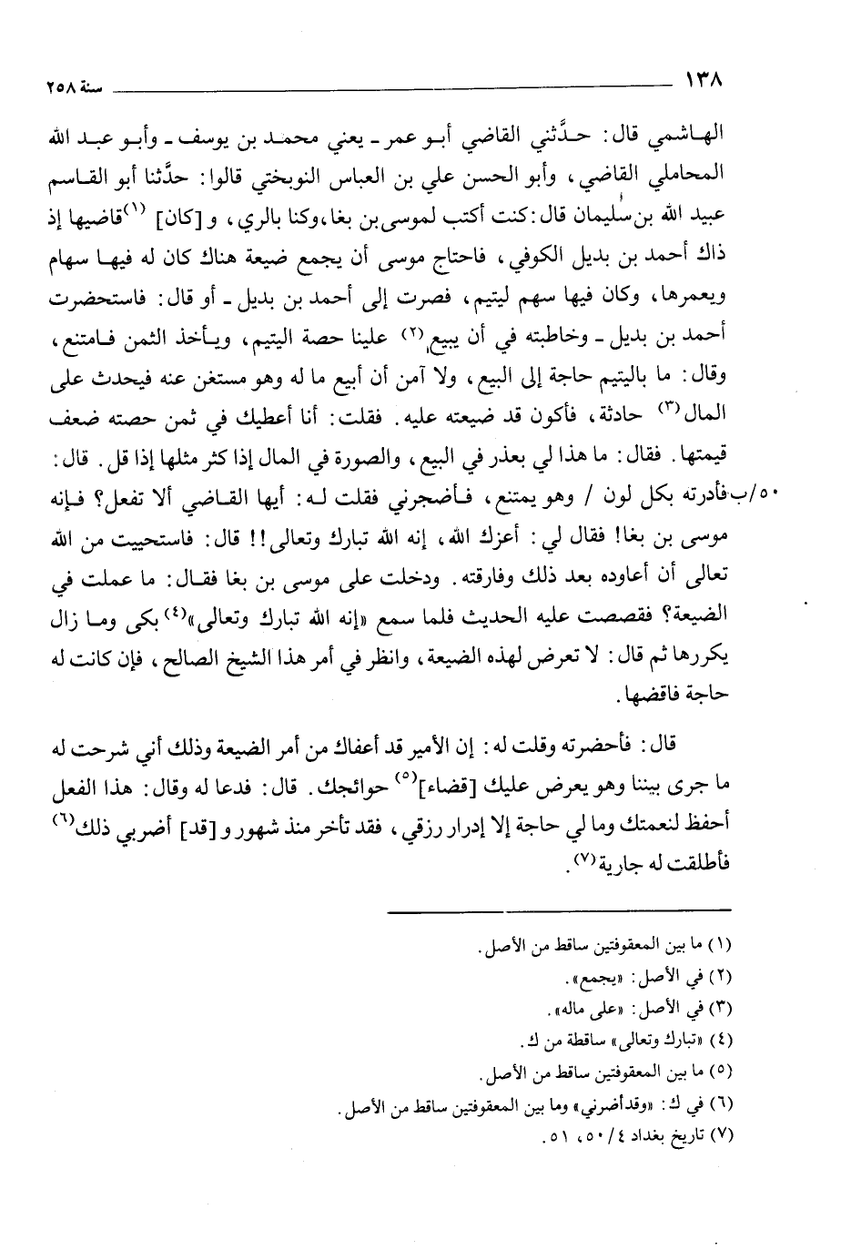 فأدرته بكل لون وهو يمتنع، فأضجرني فقلت له: أيها القاضي ألا تفعل؟ فإنه موسى بن بغا! فقال لي: أعزك الله، إنه الله تبارك وتعالى!! قَالَ: فاستحييت من الله تَعَالَى أن أعاوده بعد ذلك وفارقته. ودخلت على موسى بْن بغا فقال: ما عملت في الضيعة؟ فقصصت عليه الحديث فلما سمع «انه الله تبارك وتعالى» [4] بكى وما زال يكررها ثم قَالَ: لا تعرض لهذه الضيعة، وانظر في أمر هذا الشيخ الصالح، فان كانت له حاجة فاقضها.