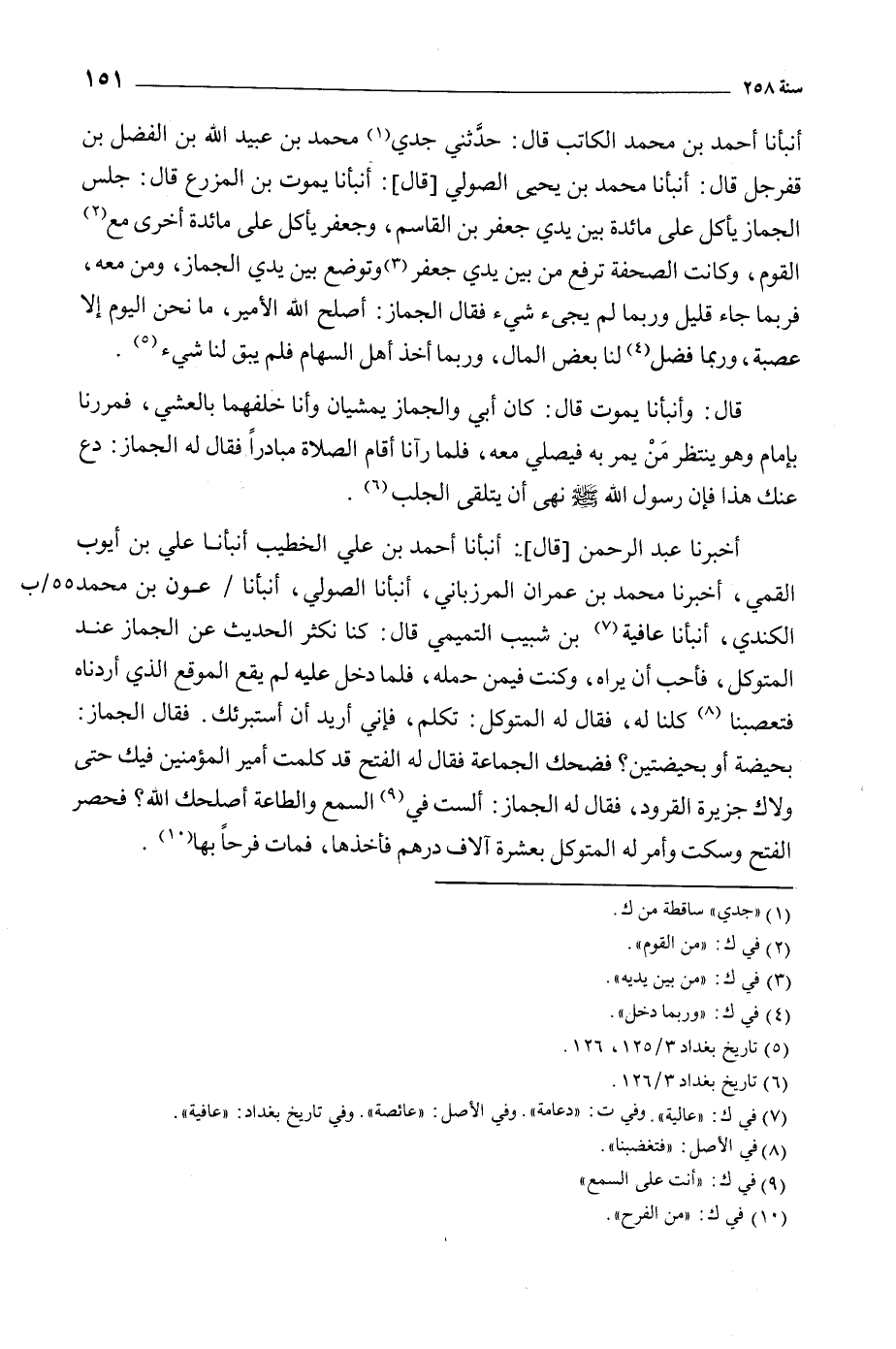 أَنْبَأَنَا أَحْمَد بن مُحَمَّد الكاتب قَالَ: حدثني جدي [1] محمد بن عبيد الله بن الفضل بن قفرجل قال: أنبأنا محمد بن يحيى الصولي [قَالَ] : أَنْبَأَنَا يموت بن المزرع قَالَ: جلس الجماز يأكل على مائدة بين يدي جعفر بن القاسم، وجعفر يأكل على مائدة أخرى مَعَ [2] القوم، وكانت الصحفة ترفع من بين يدي جَعْفَر [3] وتوضع بين يدي الجماز، ومن معه، فربما جاء قليل وربما لم يجئ شيء فقال الجماز: أصلح الله الأمير، ما نحن اليوم إلا عصبة، وربما فضل [4] لنا بعض المال، وربما أخذ أهل السهام فلم يبق لنا شيء [5] .