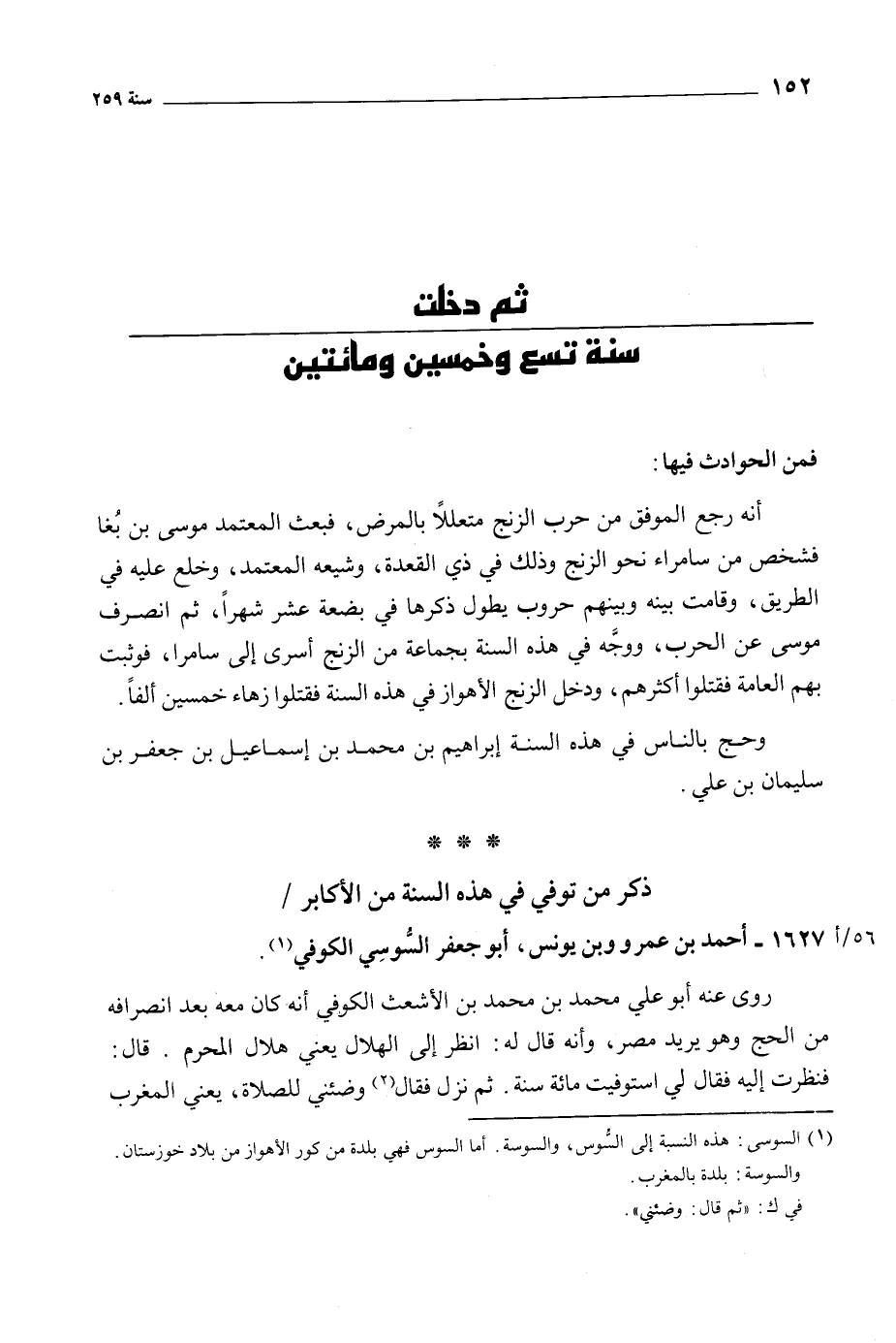 أنه رجع الموفق من حرب الزنج متعللا بالمرض، فبعث المعتمد موسى بن بغا فشخص من سامراء نحو الزنج وذلك في ذي القعدة، وشيعه المعتمد، وخلع عليه في الطريق، وقامت بينه وبينهم حروب يطول ذكرها في بضعة عشر شهرا، ثم انصرف موسى عن الحرب، ووجّه في هذه السنة بجماعة من الزنج أسرى إلى سامرا، فوثبت بهم العامة فقتلوا أكثرهم، ودخل الزنج الأهواز في هذه السنة فقتلوا زهاء خمسين ألفا.