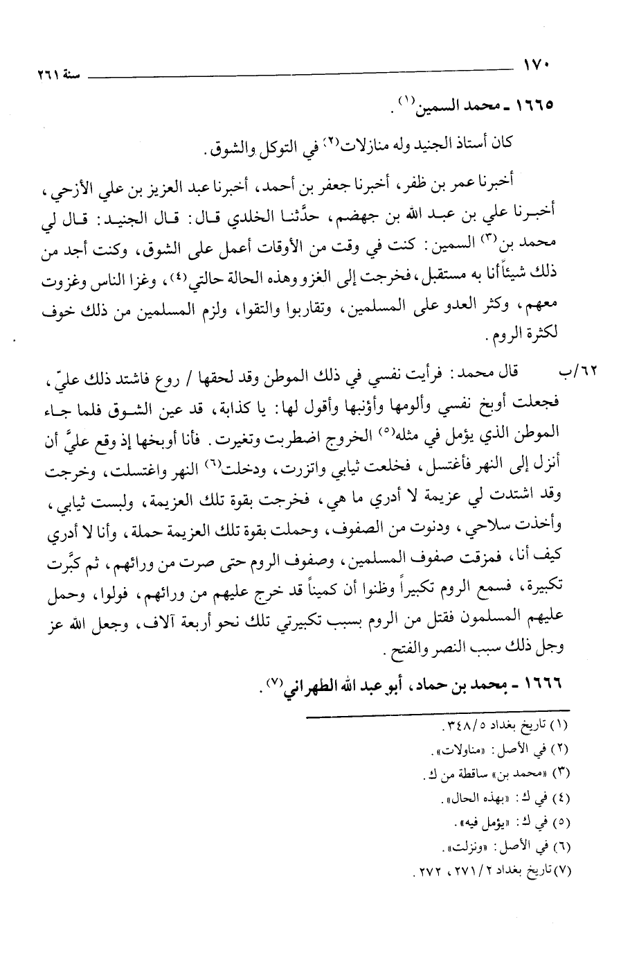 أَخْبَرَنَا عمر بن ظفر، أخبرنا جعفر بن أحمد، أَخْبَرَنَا عَبْدُ الْعَزِيزِ بْنُ عَلِيٍّ الأَزَجِيُّ، أَخْبَرَنَا علي بن عبد الله بن جهضم، حَدَّثَنَا الخلدي قَالَ: قَالَ الجنيد: قَالَ لي مُحَمَّد بْن [3] السمين: كنت في وقت من الأوقات أعمل على الشوق، وكنت أجد من ذلك شيئا أنا به مستقبل، فخرجت إلى الغزو وهذه الحالة حالتي [4] ، وغزا الناس وغزوت معهم، وكثر العدو على المسلمين، وتقاربوا والتقوا، ولزم المسلمين من ذلك خوف لكثرة الروم.