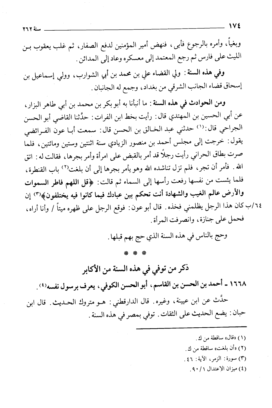ومن الحوادث في هذه السنة: ما أَنْبَأَنَا به أبو بكر بن مُحَمَّد بن أبي طاهر البزار، عن أبي الحسين بن المهتدي قَالَ: رأيت بخط ابن الفرات: حَدَّثَنَا القاضي أبو الحسن الجراحي قال: [1] حدثني عبد الخالق بن الحسن قَالَ: سمعت أبا عون الفرائضي يقول: خرجت إلى مجلس أَحْمَد بن منصور الزيادي سنة اثنتين وستين ومائتين، فلما صرت بطاق الحراني رأيت رجلا قد أمر بالقبض على امرأة وأمر بجرها، فقالت له: اتق الله. فأمر أن تجر، فلم تزل تناشده الله وهو يأمر بجرها إلى أن بلغت [2] باب القنطرة، فلما يئست من نفسها رفعت رأسها إلى السماء ثم قالت: قُلِ اللَّهُمَّ فاطِرَ السَّماواتِ وَالْأَرْضِ عالِمَ الْغَيْبِ وَالشَّهادَةِ أَنْتَ تَحْكُمُ بَيْنَ عِبادِكَ في ما كانُوا فِيهِ يَخْتَلِفُونَ 39: 46 [3] إن كان هذا الرجل يظلمني فخذه. قَالَ أبو عون: فوقع الرجل على ظهره ميتا وأنا أراه، فحمل على جنازة، وانصرفت المرأة.