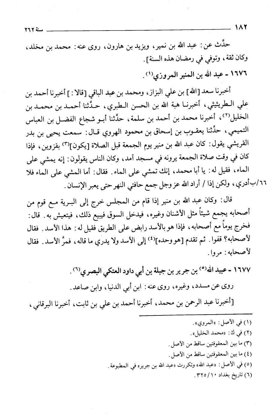 أَخْبَرَنَا سعد [الله] بن علي البزاز، ومحمد بن عبد الباقي [قالا:] أَخْبَرَنَا أَحْمَدُ بْنُ عَلِيٍّ الطُّرَيْثِيثِيُّ، أَخْبَرَنَا هِبَةُ الله بن الحسن الطبري، حدّثنا أحمد بن محمد بن الخليل [2] ، أَخْبَرَنَا مُحَمَّد بن أَحْمَد بن سلمة، حَدَّثَنَا أبو شجاع الفضل بن العباس التميمي، حَدَّثَنَا يعقوب بن إسحاق بن محمود الهروي قَالَ: سمعت يحيى بن بدر القريشي يقول: كان عَبْد اللَّهِ بن منير يوم الجمعة قبل الصلاة [يكون] [3] بقزوين، فإذا كان في وقت صلاة الجمعة يرونه في مسجد آمد، وكان الناس يقولون: إنه يمشي على الماء، فقيل له: يا أبا محمد، إنك تمشي على الماء. فقال: أما المشي على الماء فلا أدري، ولكن إذا أراد الله عز وجل جمع حافتي النهر حتى يعبر الإنسان.