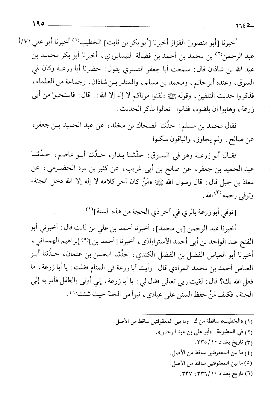 فَقَالَ أَبُو زُرْعَةَ وَهُوَ فِي السُّوقِ: حَدَّثَنَا بُنْدَارٌ، حَدَّثَنَا أَبُو عَاصِمٍ، حَدَّثَنَا عَبْدُ الْحَمِيدِ بْنُ جَعْفَرٍ، عَنْ صَالِحِ بْنِ أَبِي غَرِيبٍ، عَنْ كَثِيرِ بْنِ مُرَّةَ الْحَضْرَمِيِّ، عَنْ مُعَاذِ بْنِ جَبَلٍ قَالَ: قَالَ رَسُولُ اللَّهِ صَلَّى اللَّهُ عَلَيْهِ وَسَلَّمَ «مَنْ كَانَ آخِرُ كَلامِهِ لا إِلَهَ إِلا اللَّهُ دَخَلَ الْجَنَّةَ» وَتُوُفِّيَ رَحِمَهُ [3] اللَّهُ.