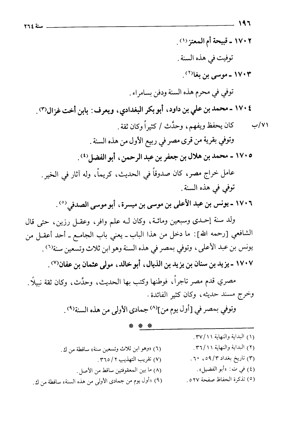 ولد سنة إحدى وسبعين ومائة، وكان له علم وافر، وعقل رزين، حتى قَالَ الشافعي [رحمه الله] : ما دخل من هذا الباب- يعني باب الجامع- أحد أعقل من يونس بن عبد الأعلى، وتوفي بمصر في هذه السنة وَهُوَ ابن ثلاث وتسعين سنة [6] .