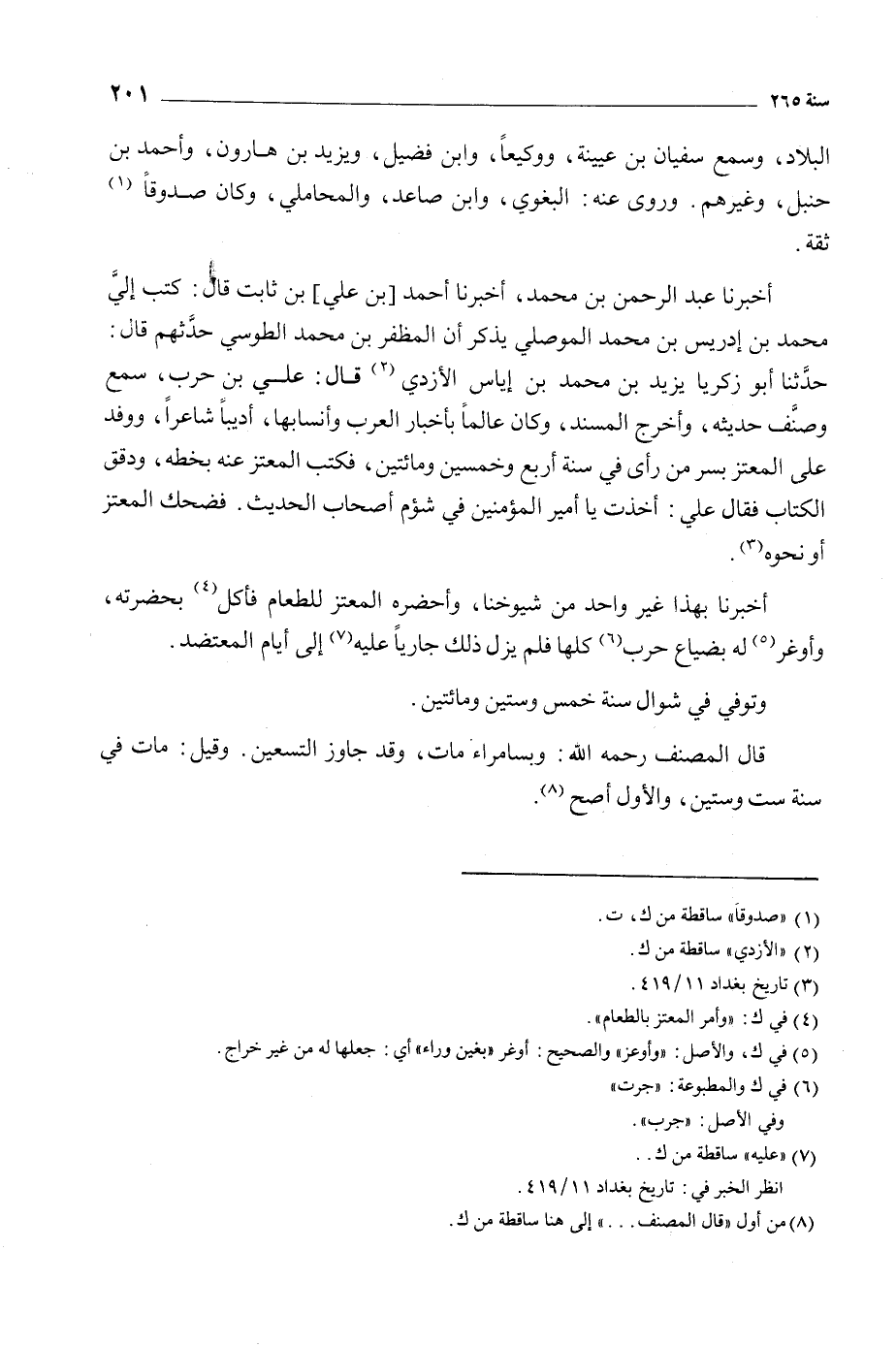 أخبرنا بهذا غير واحد من شيوخنا، وأحضره المعتز للطعام فأكل [4] بحضرته، وأوغر [5] لَهُ بضياع حَرْب [6] كلها فلم يزل ذلك جاريا عليه [7] إلى أيام المعتضد.