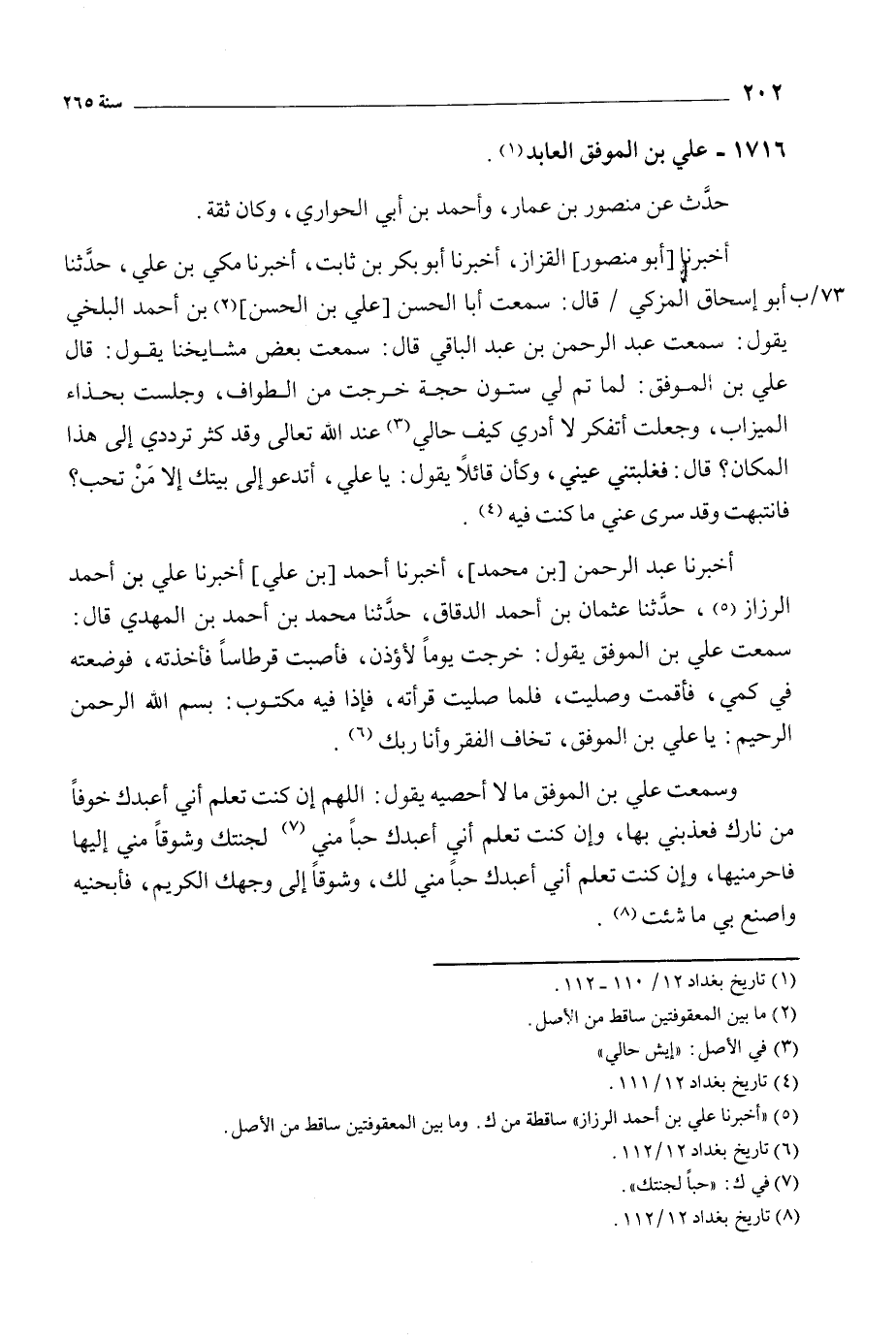 أَخْبَرَنَا [أَبُو مَنْصُورٍ] الْقَزَّازُ، أَخْبَرَنَا أَبُو بَكْرٍ بن ثابت، أَخْبَرَنَا مكي بن علي، حَدَّثَنَا أبو إسحاق المزكي/ قَالَ: سمعت أبا الحسن [علي بن الحسن] [2] بن أَحْمَد البلخي يقول: سمعت عَبْد الرَّحْمَنِ بن عبد الباقي قَالَ: سمعت بعض مشايخنا يقول: قَالَ علي بن الموفق: لما تم لي ستون حجة خرجت من الطواف، وجلست بحذاء الميزاب، وجعلت أتفكر لا أدري كيف حالي [3] عند الله تعالى وقد كثر ترددي إلى هذا المكان؟ قَالَ: فغلبتني عيني، وكأن قائلا يقول: يا علي، أتدعو إلى بيتك إلا من تحب؟