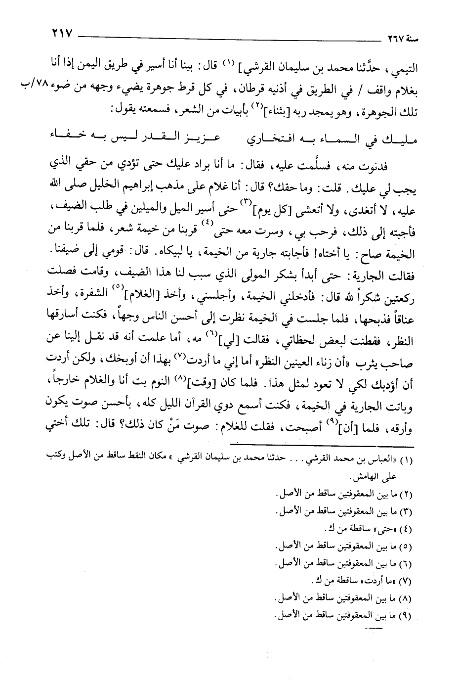 فقالت الجارية: حتى أبدأ بشكر المولى الذي سبب لنا هذا الضيف، وقامت فصلت ركعتين شكرا للَّه قَالَ: فأدخلني الخيمة، وأجلسني، وأخذ [الغلام] [5] الشفرة، وأخذ عناقا فذبحها، فلما جلست في الخيمة نظرت إلى أحسن الناس وجها، فكنت أسارقها النظر، ففطنت لبعض لحظاتي، فقالت [لي] [6] مه، أما علمت أنه قد نقل إلينا عن صاحب يثرب «أن زناء العينين النظر» أما إني ما أردت [7] بهذا أن أوبخك، ولكن أردت أن أؤدبك لكي لا تعود لمثل هذا. فلما كان [وقت] [8] النوم بت أنا والغلام خارجا، وباتت الجارية في الخيمة، فكنت أسمع دوي القرآن الليل كله، بأحسن صوت يكون وأرقه، فلما [أن] [9] أصبحت، فقلت للغلام: صوت من كان ذلك؟ قَالَ: تلك أختي